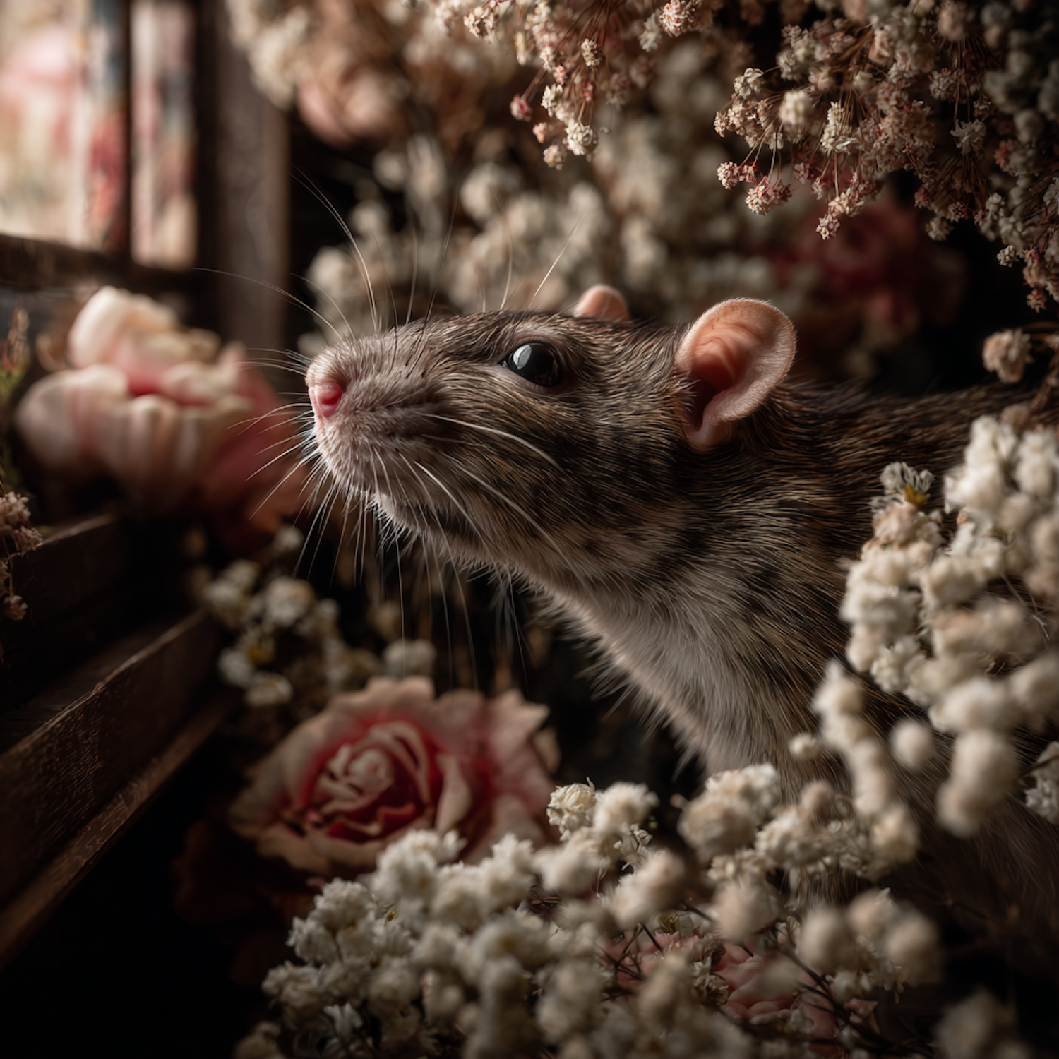 A close-up of a rat surrounded by dried flowers and roses, with warm lighting highlighting its features and the floral textures.