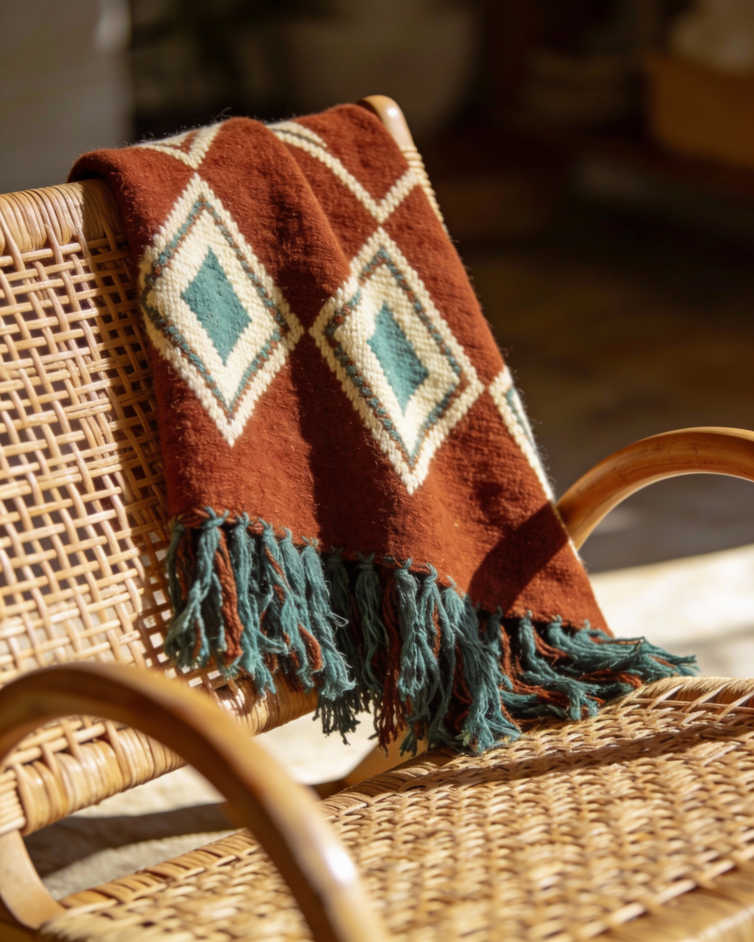 A burnt sienna throw with hand‑loomed diamond patterns in cream and muted teal is draped over the back of a cane‑woven lounge chair. The fringe is thick and uneven, emphasizing its artisanal feel. Soft morning light casts warm shadows across the scene, giving it a crafted, earthy mood.