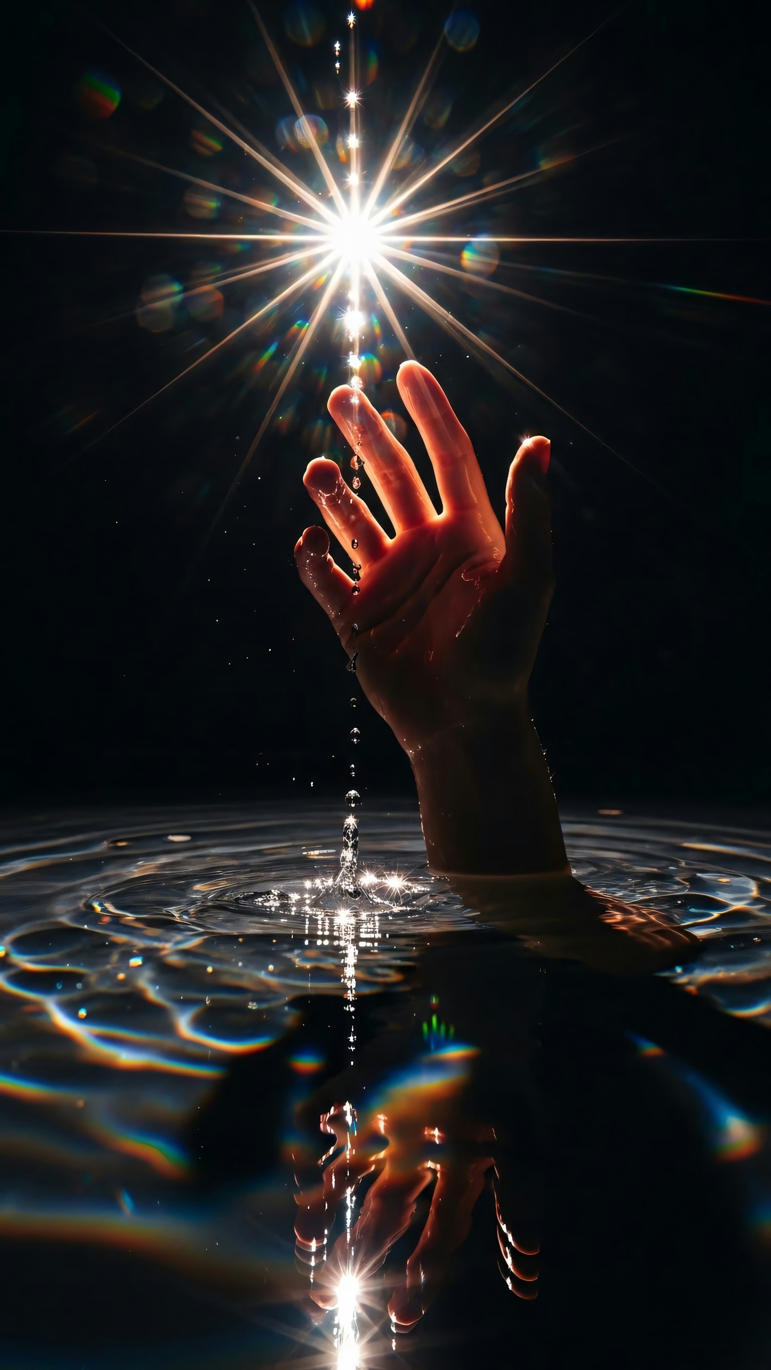 A hand reaches through water towards a radiant light, with droplets and reflections creating a dynamic and ethereal visual effect.