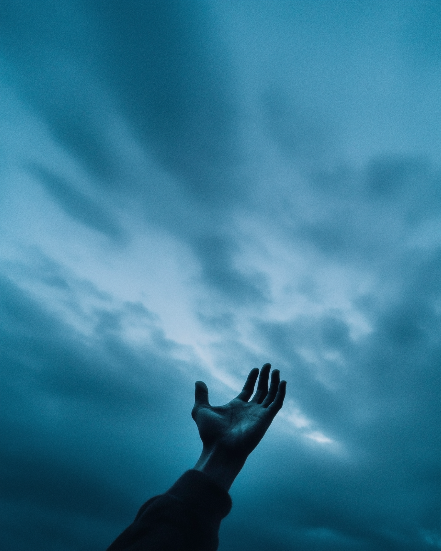 A silhouetted hand reaching towards a dramatic blue sky filled with clouds, creating a moody and contemplative atmosphere.