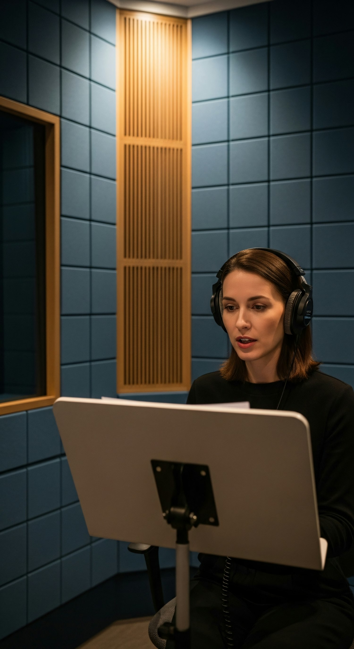A woman in a soundproof studio wearing headphones, reading from a script on a stand. Professional recording setup with acoustic panels.
