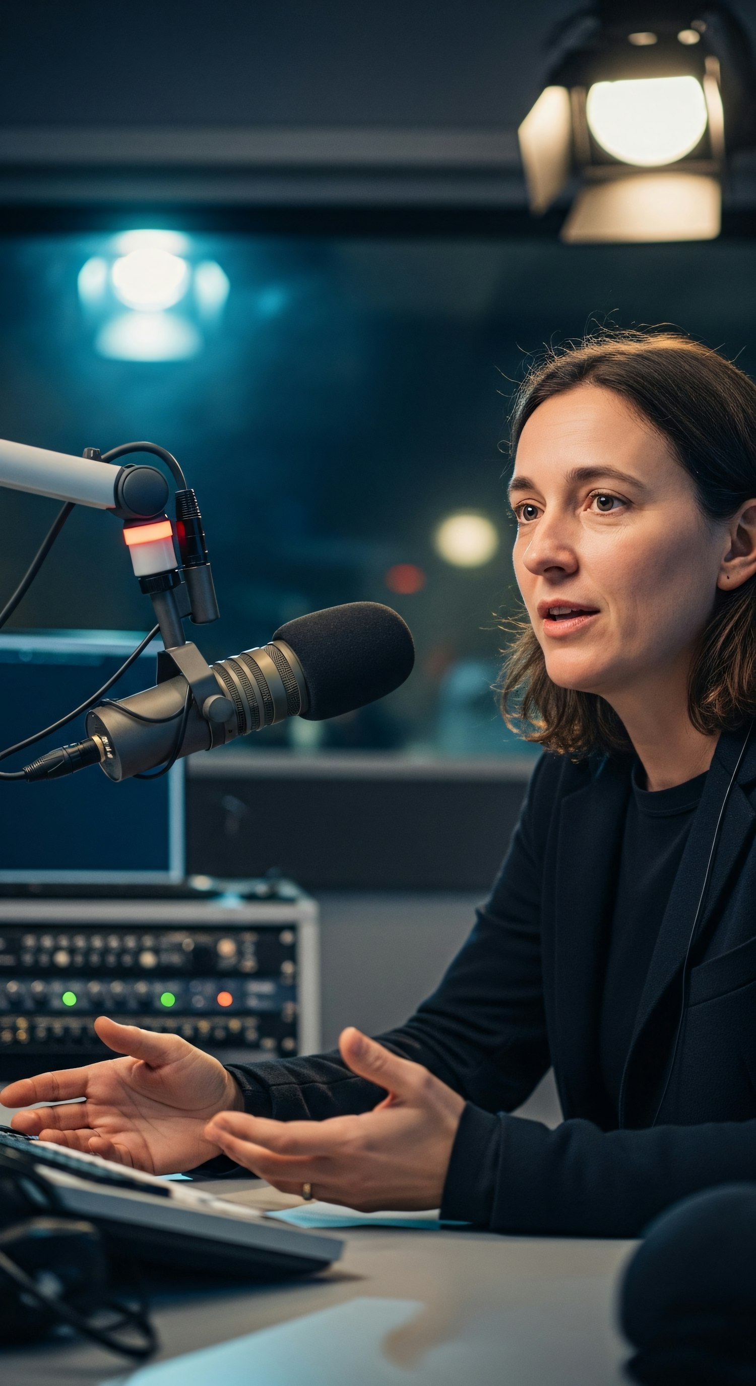 A woman in a recording studio speaks into a microphone, gesturing expressively. The setup includes professional audio equipment and soft lighting.