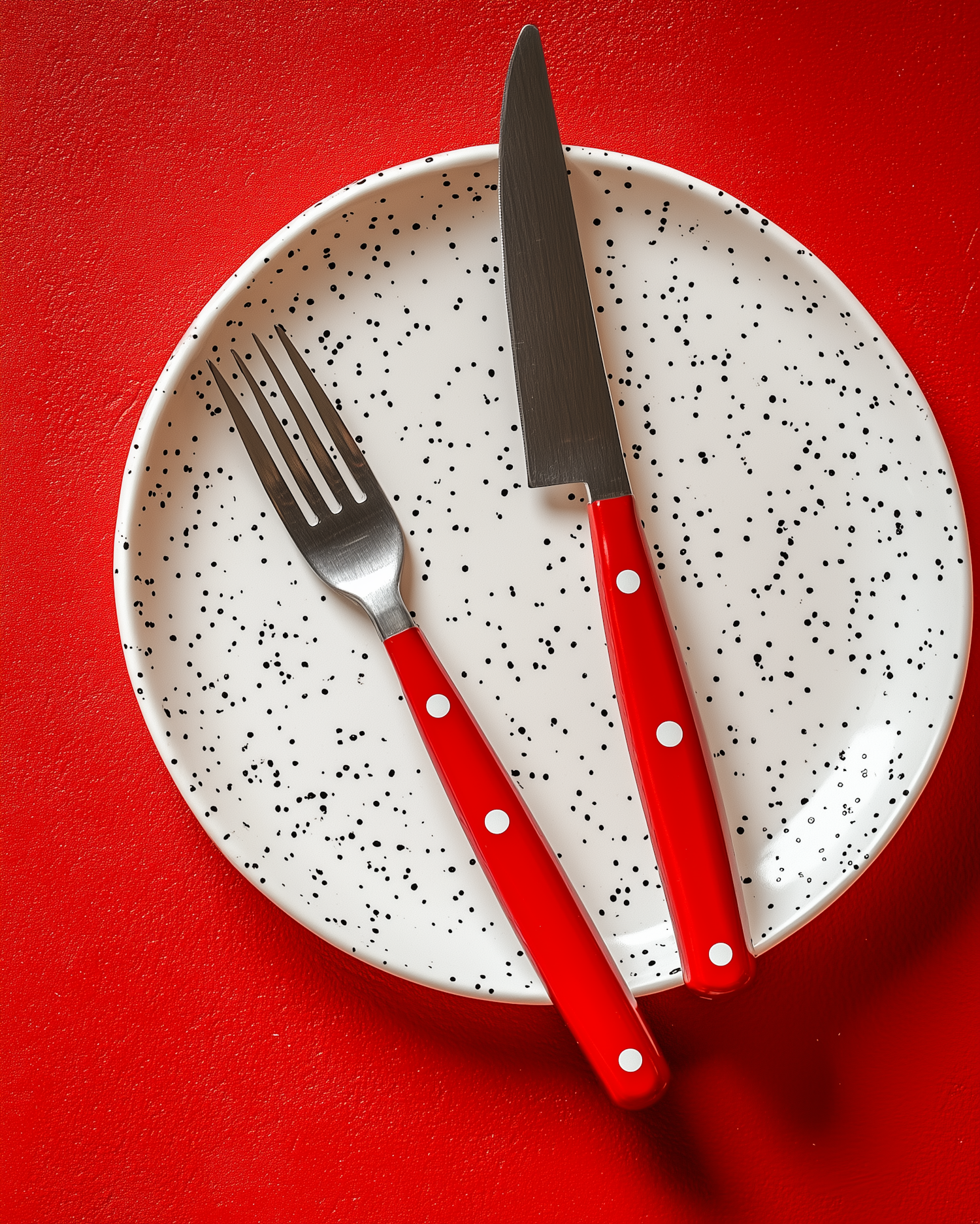 White speckled plate with red-handled cutlery on a vibrant red background, creating a bold and striking visual contrast.