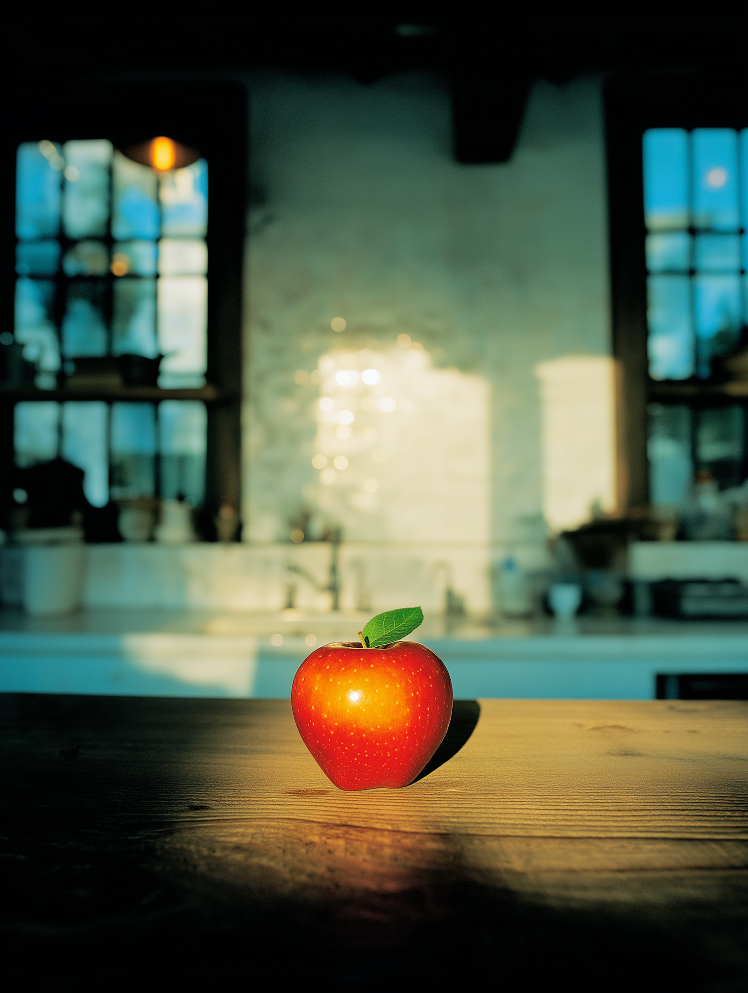 A fresh red apple with a green leaf sits on a wooden table, bathed in warm sunlight, with a softly blurred kitchen in the background.