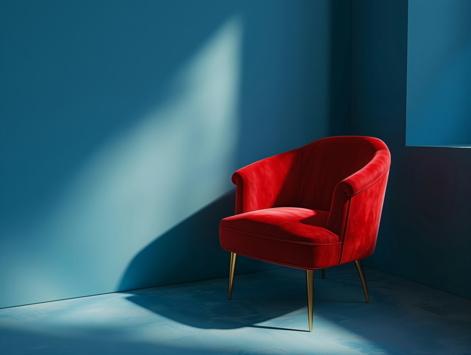 Vibrant red armchair in a minimalist blue room, creating a striking contrast with elegant lighting and modern design.