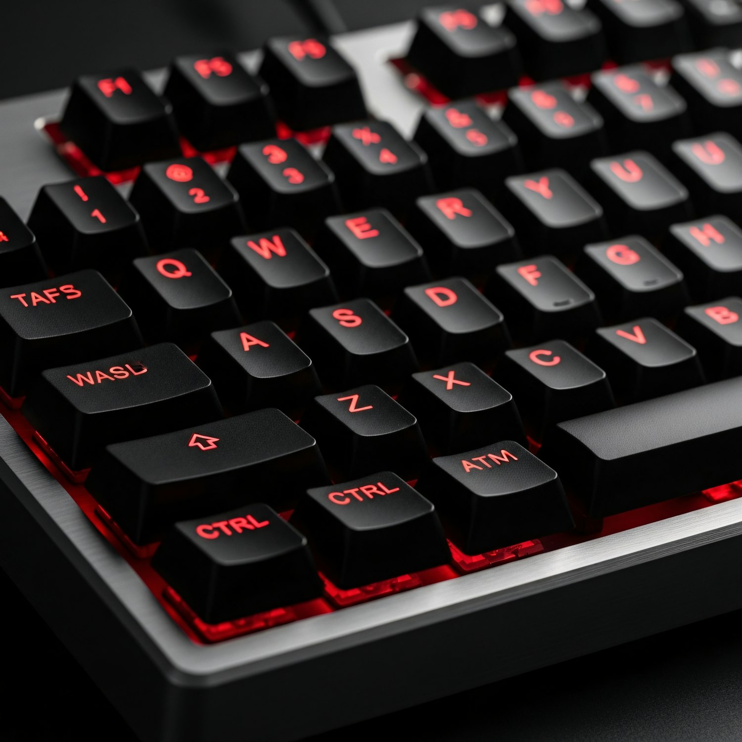 Close-up of a mechanical keyboard with black keycaps and red backlighting, showcasing a sleek design and vibrant illumination.