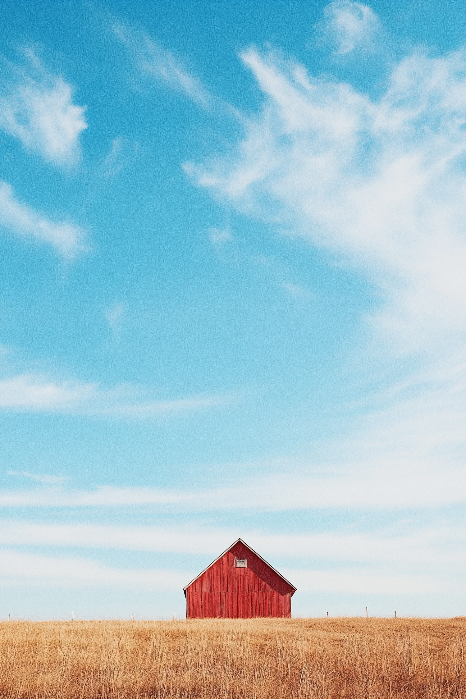A red barn in a golden field under a bright blue sky with wispy clouds. A peaceful rural scene with vibrant colors and open space.