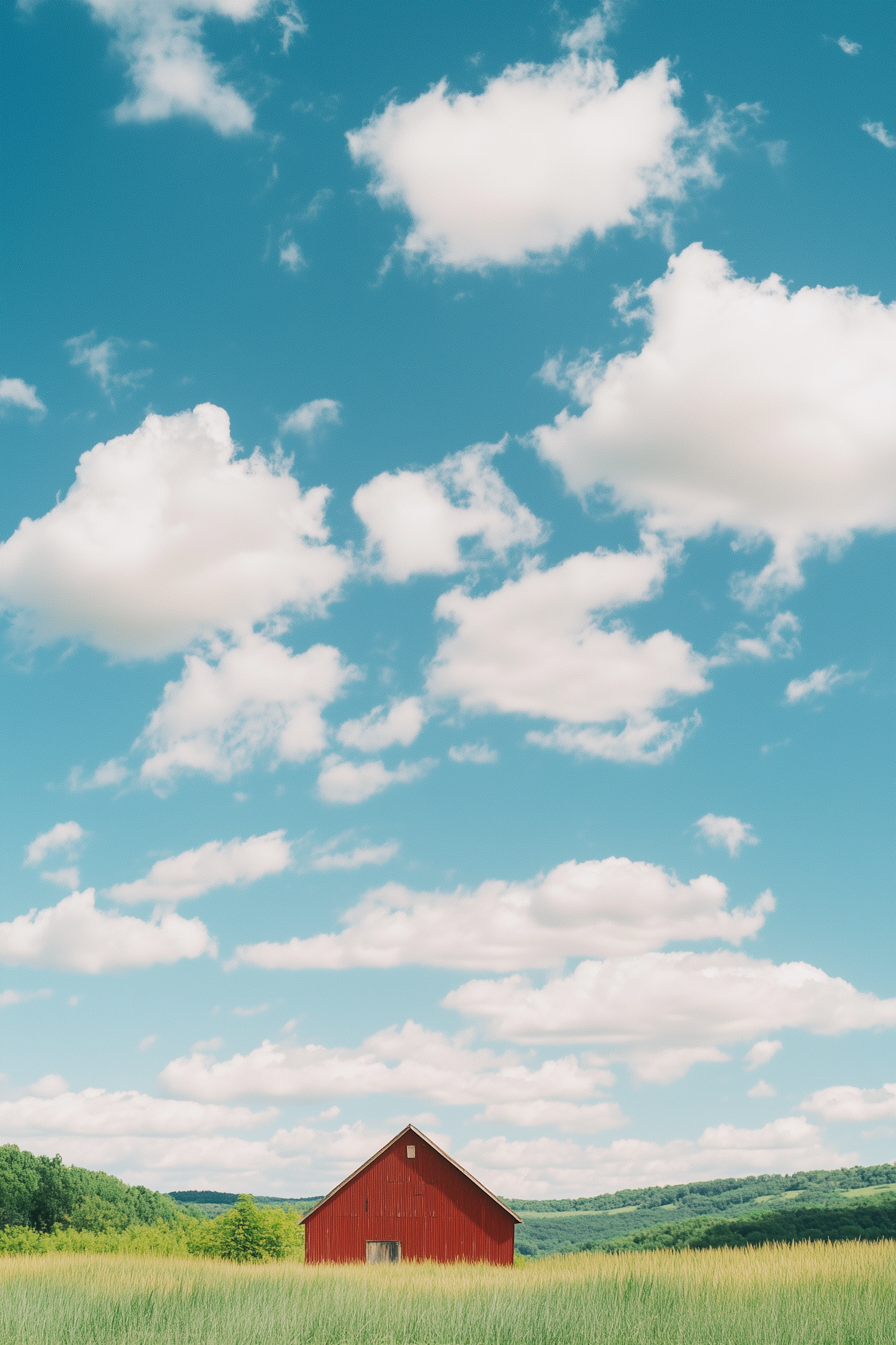 A red barn in a green field under a bright blue sky with fluffy white clouds, creating a peaceful rural landscape.