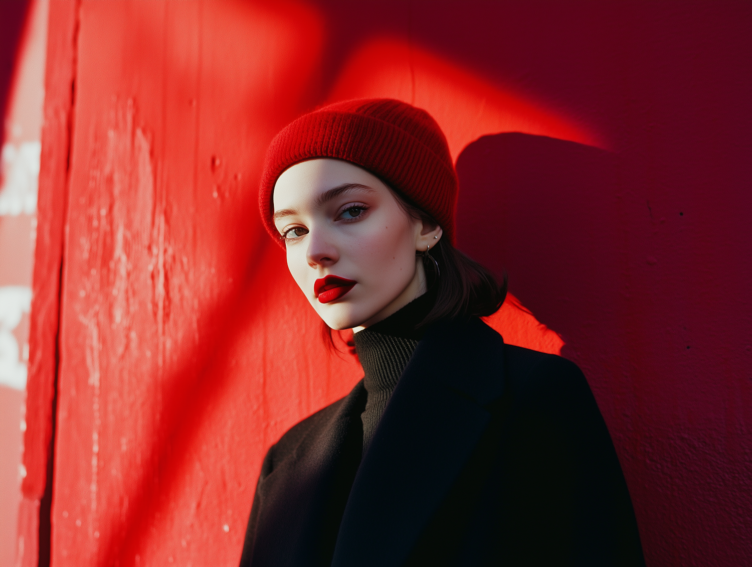 Stylish woman in red beanie and bold lipstick against a vivid red wall, exuding confidence and elegance.