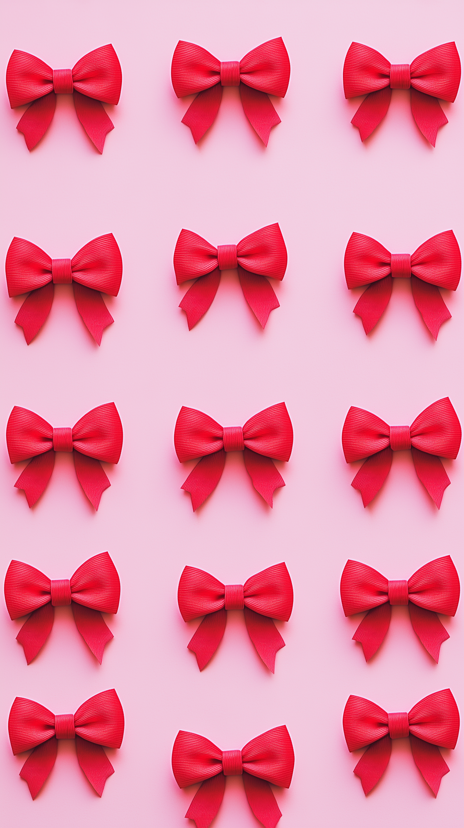 Symmetrical grid of vibrant red bows on a pastel pink background, creating a festive and playful aesthetic.
