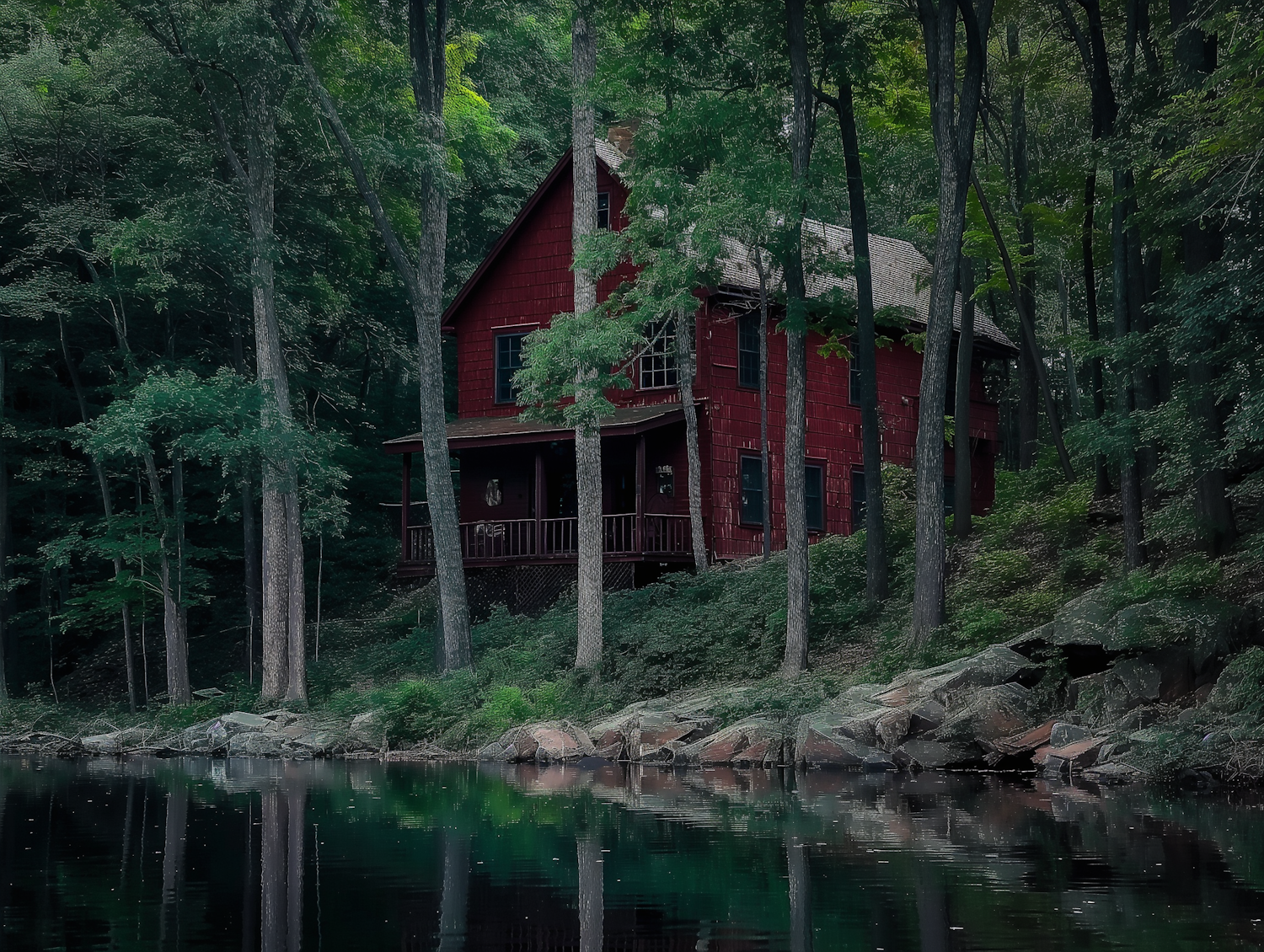 Rustic red cabin surrounded by lush forest and reflected in a tranquil pond, creating a serene and secluded atmosphere.