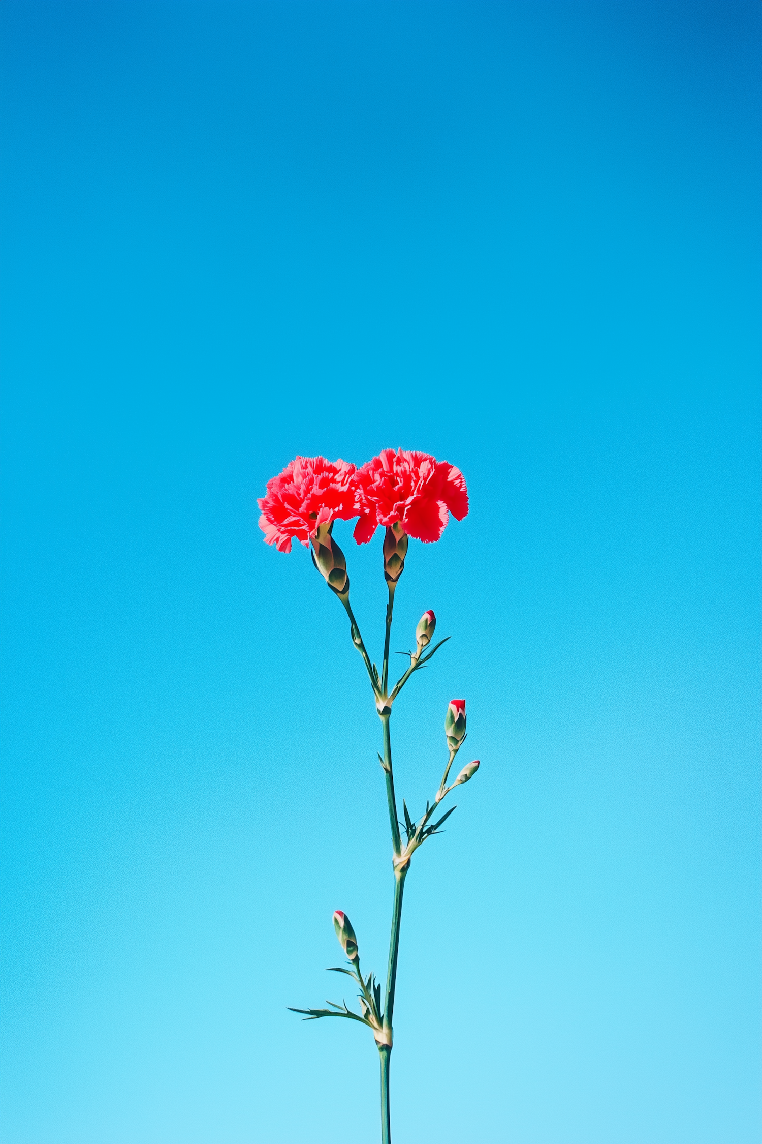 Two red carnations bloom on a green stem with buds, set against a bright blue sky. A minimalistic and vibrant floral composition.