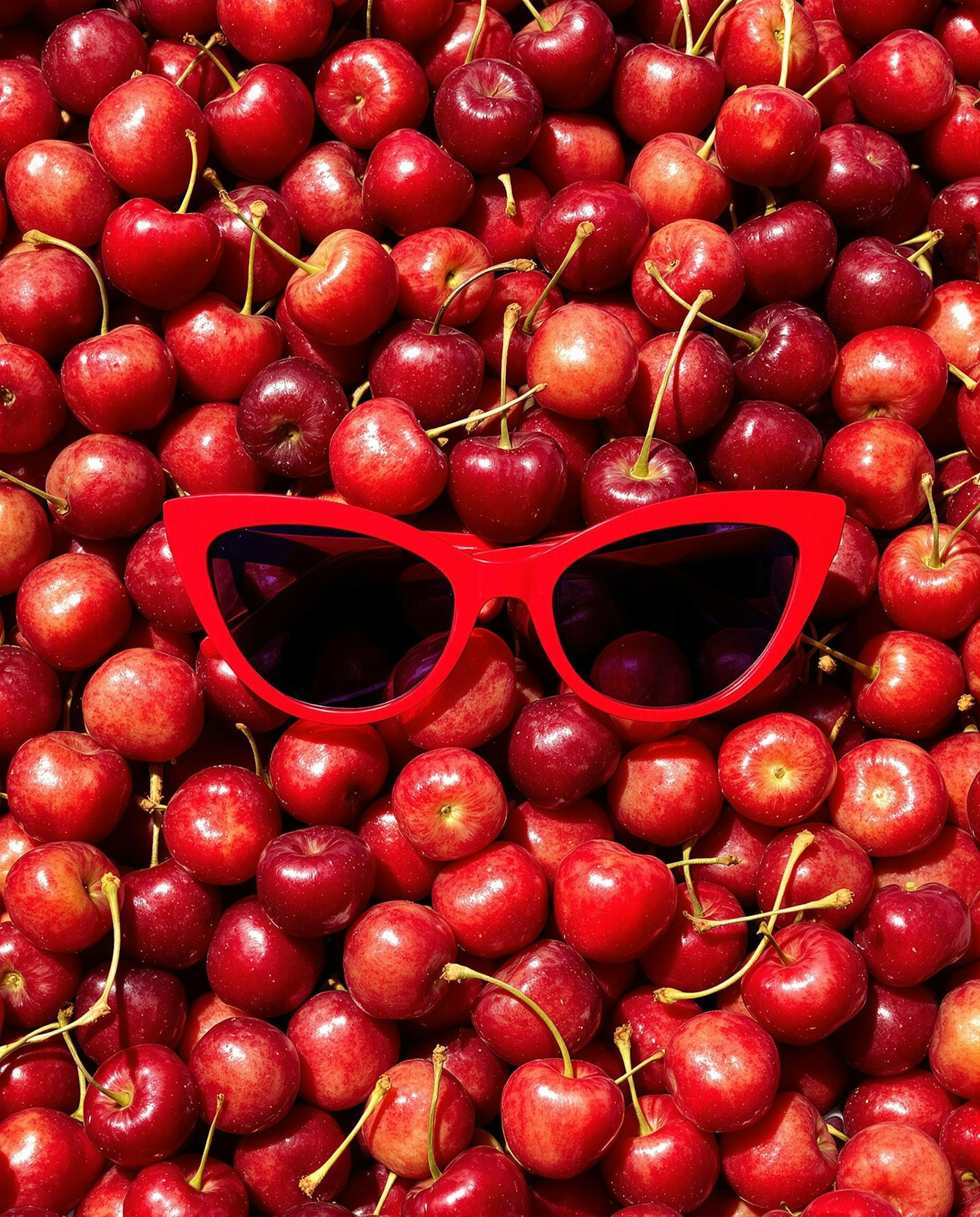 A vibrant composition showing fresh red cherries with a pair of red cat-eye sunglasses in the center, embodying summery fun.