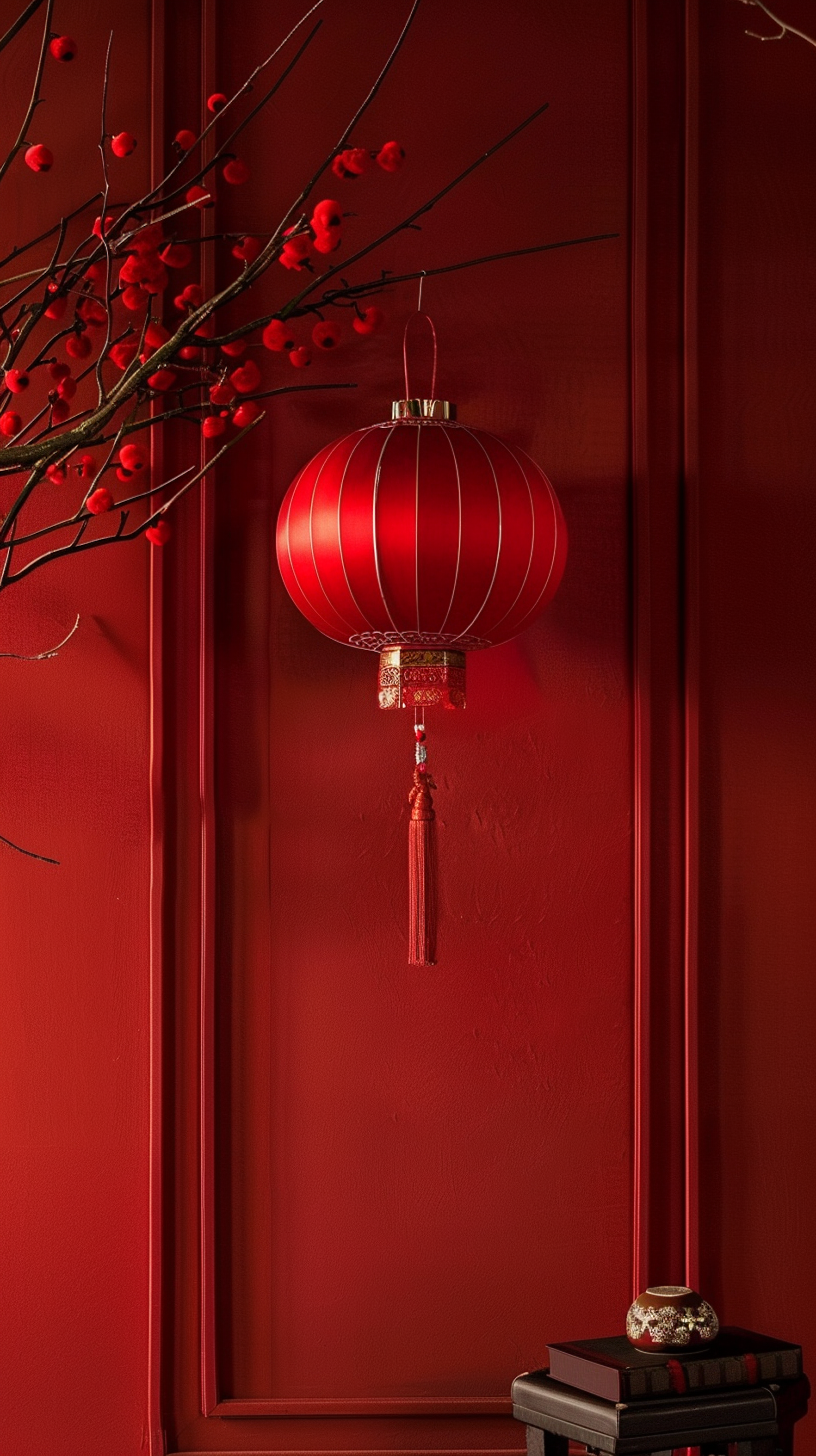 Elegant red lantern with gold details against a red wall, accompanied by a branch with berries and a decorative vase on a stool.