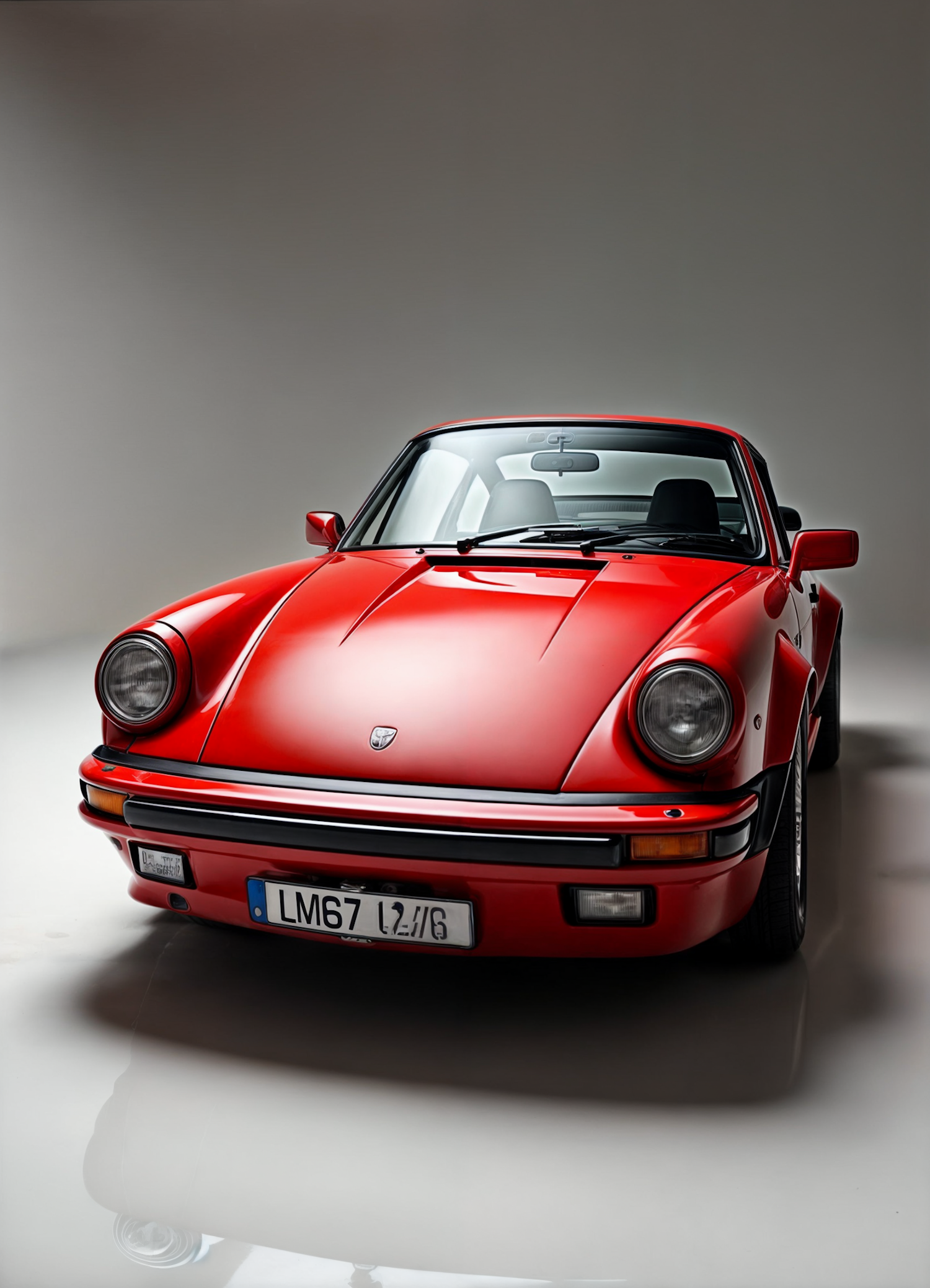 A stunning red classic sports car with round headlights and a sleek design, displayed in a clean studio setting with a neutral background.
