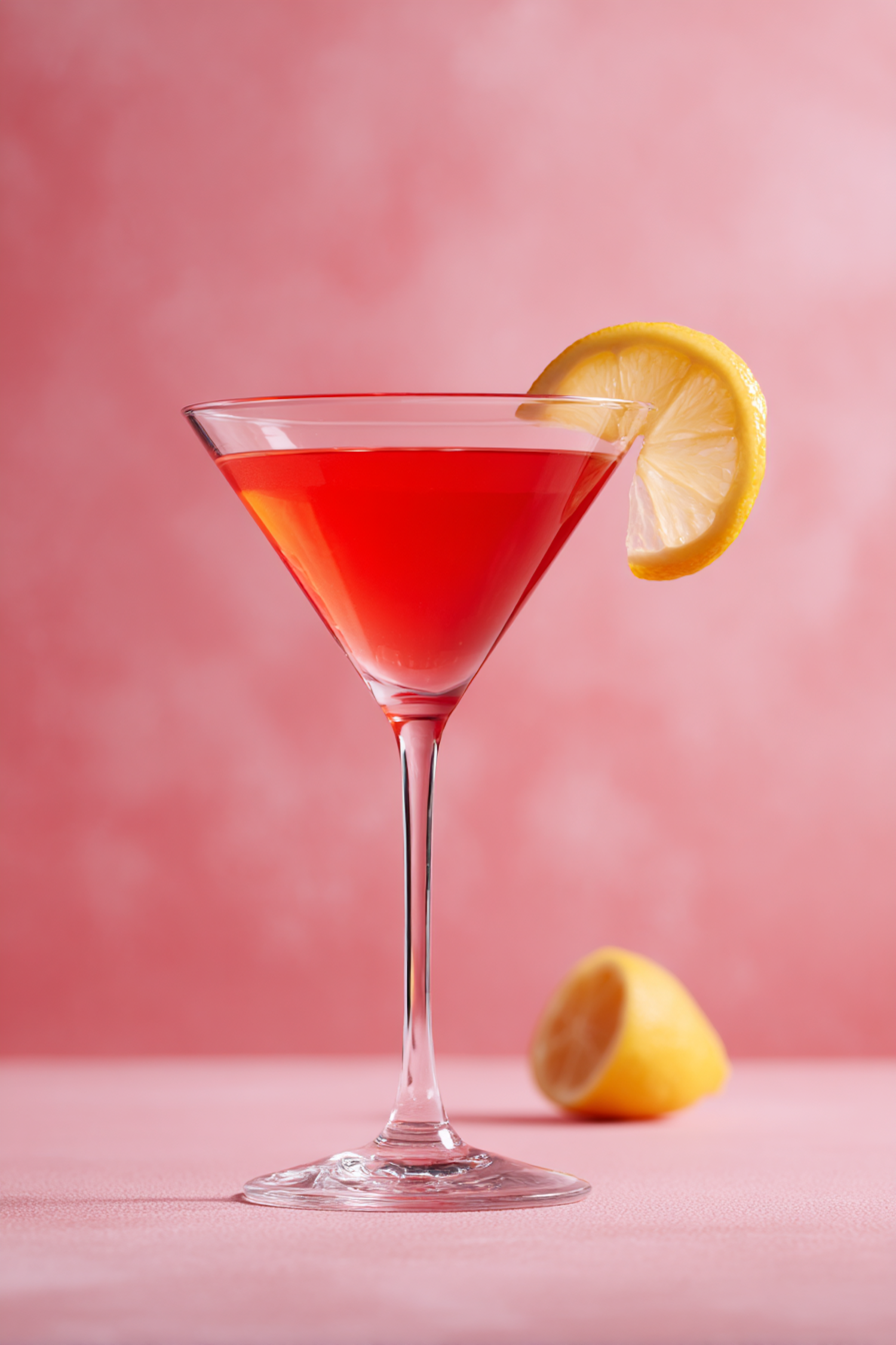 A bright red cocktail in a martini glass with a lemon slice garnish, set against a soft pink background for a fresh, vibrant look.