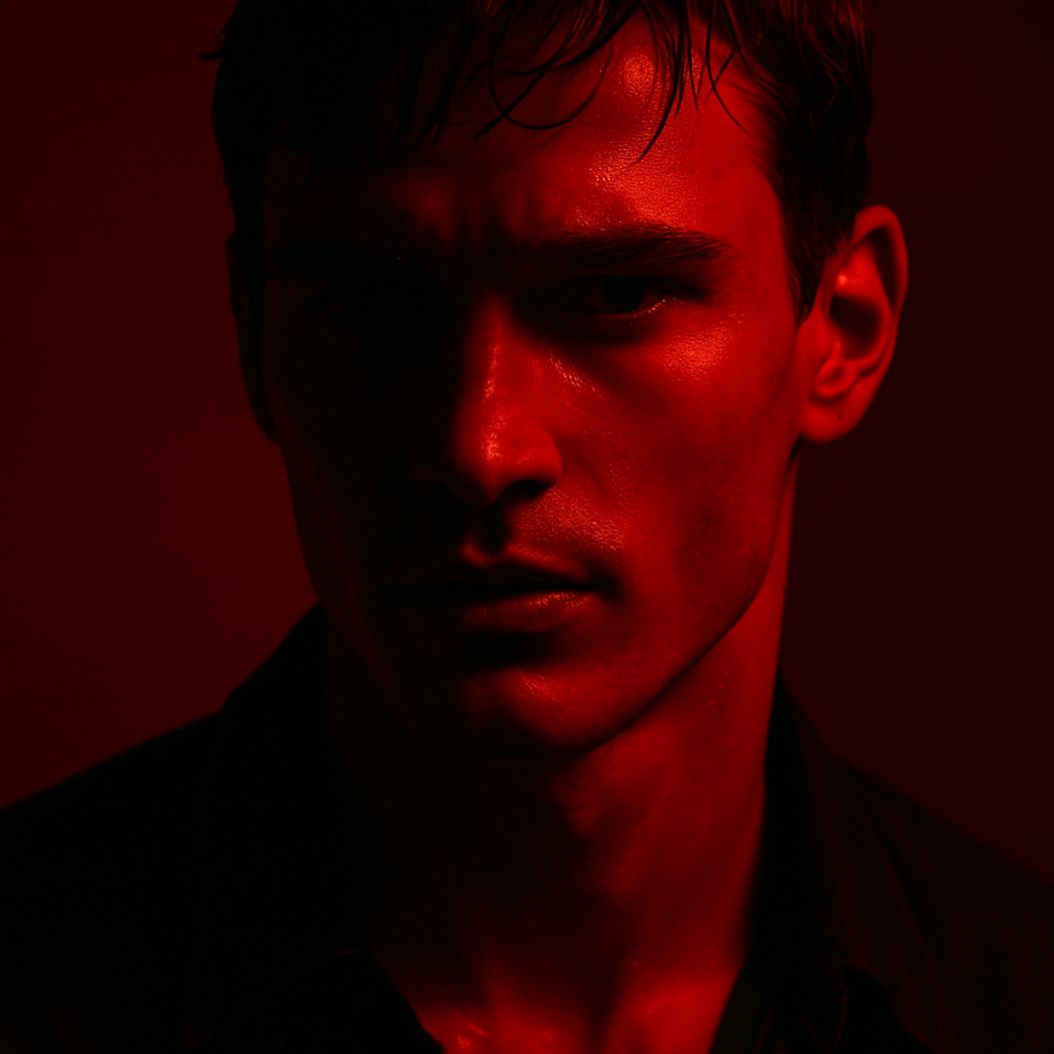 Dramatic red-lit portrait of a person highlighting facial features with intense shadow play, evoking a moody and striking atmosphere.