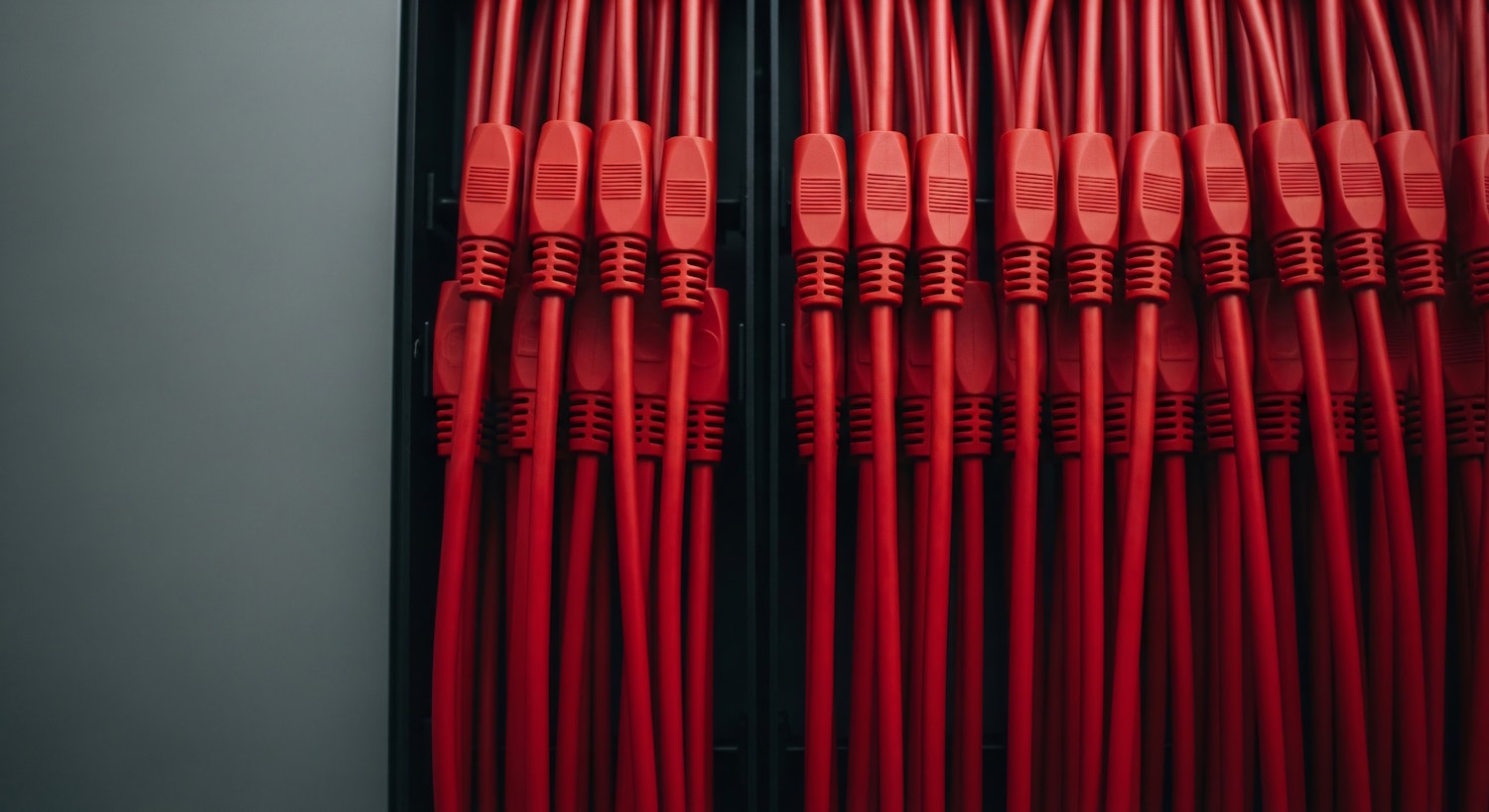 Close-up of red Ethernet cables plugged into a network switch, showcasing neat alignment and vibrant color in a tech-focused setting.