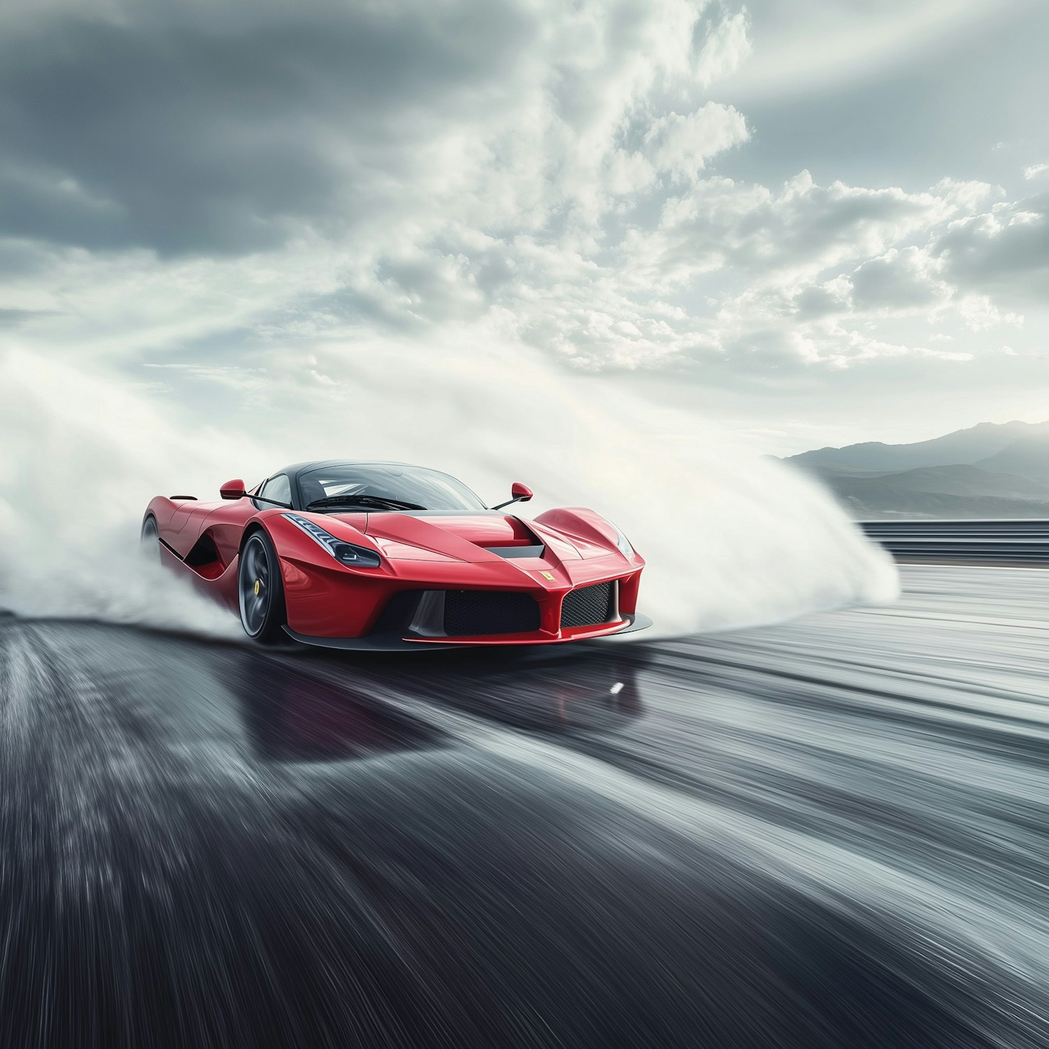 A stunning red Ferrari drifting on a wet track, with water spray and a dramatic cloudy sky in the background.