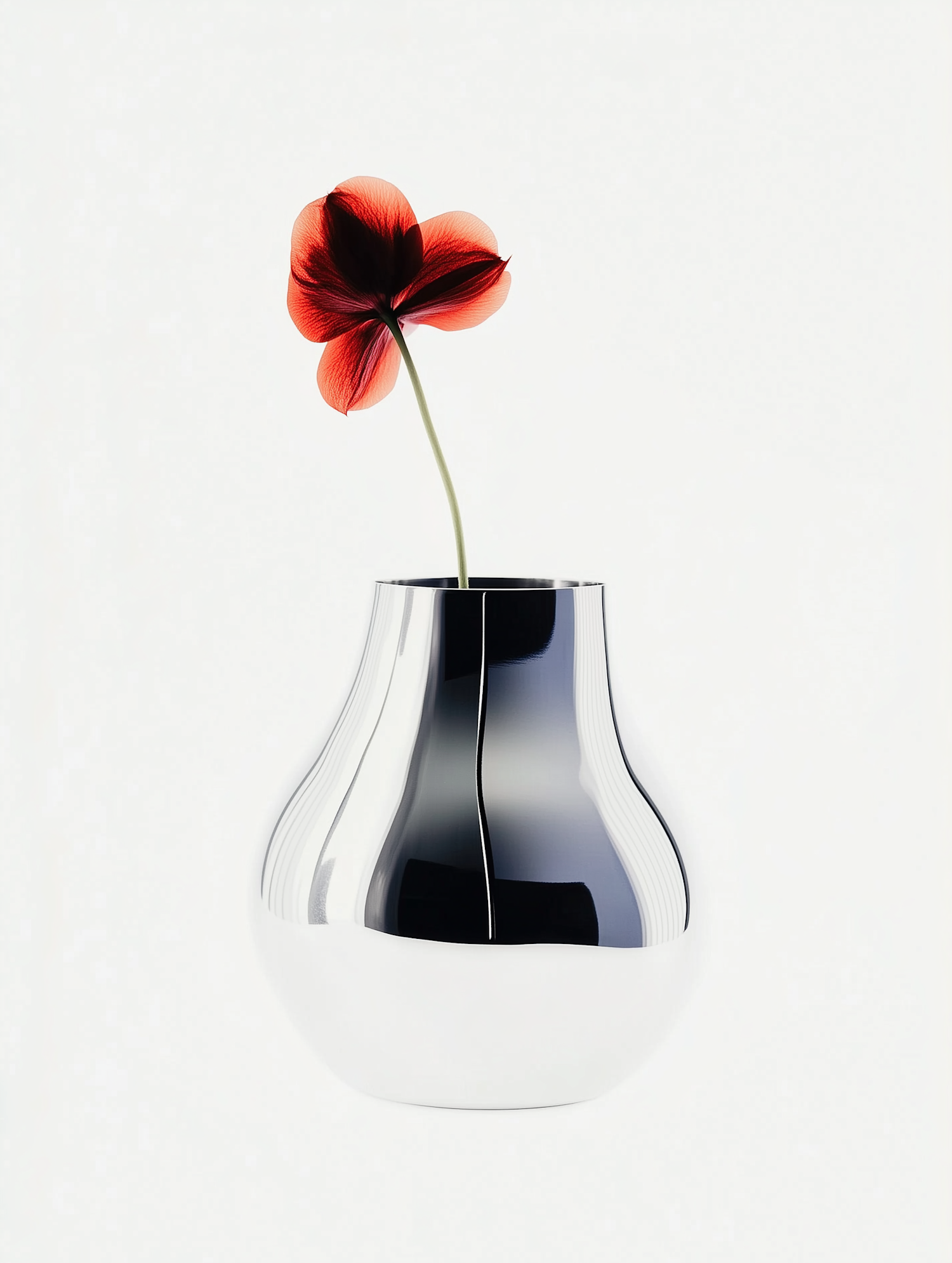 Minimalist red flower in a sleek silver vase against a white background, highlighting elegance and simplicity.