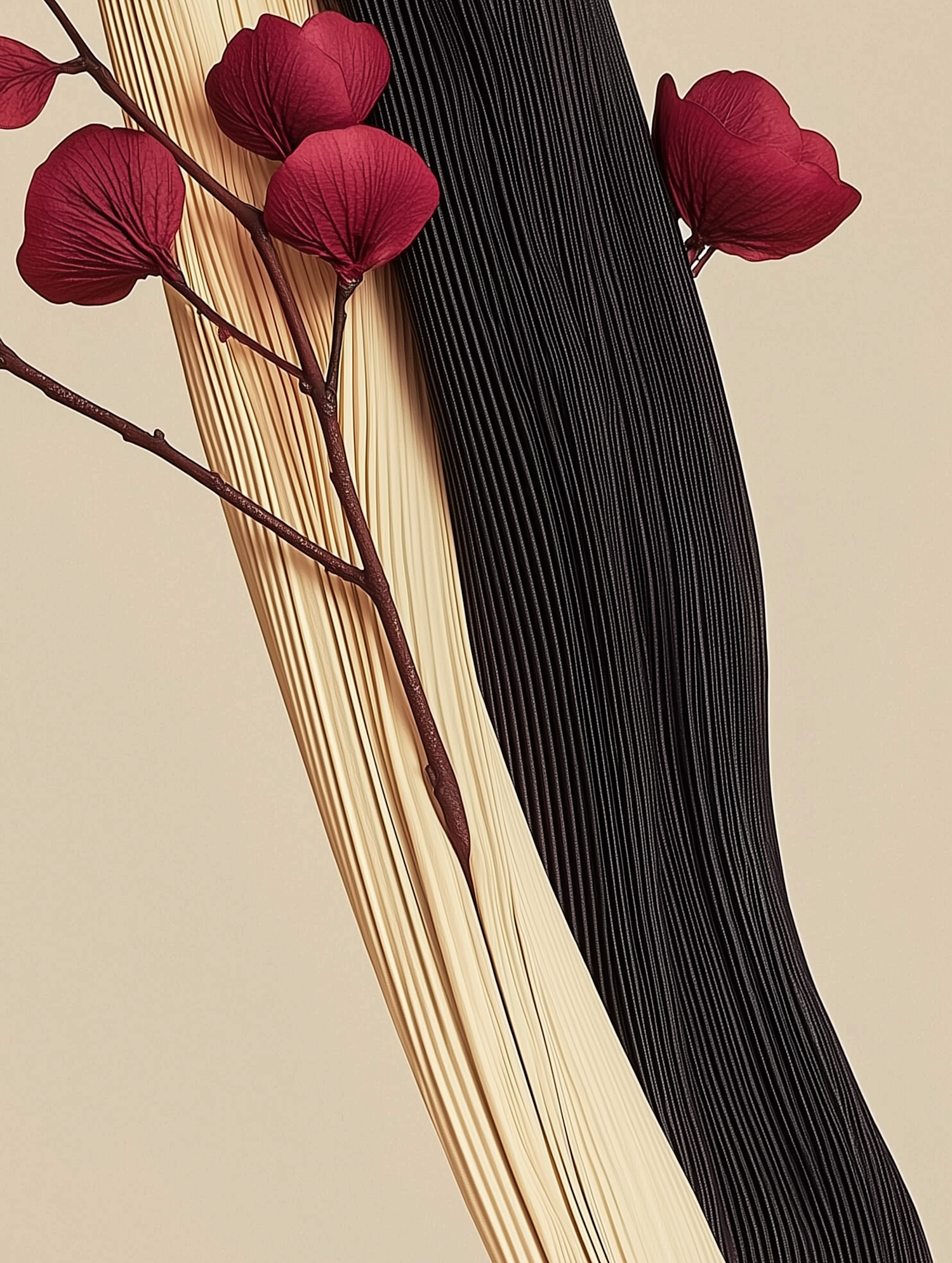 Elegant red flowers on a branch set against pleated cream and black fabric, creating a modern and minimalistic contrast.