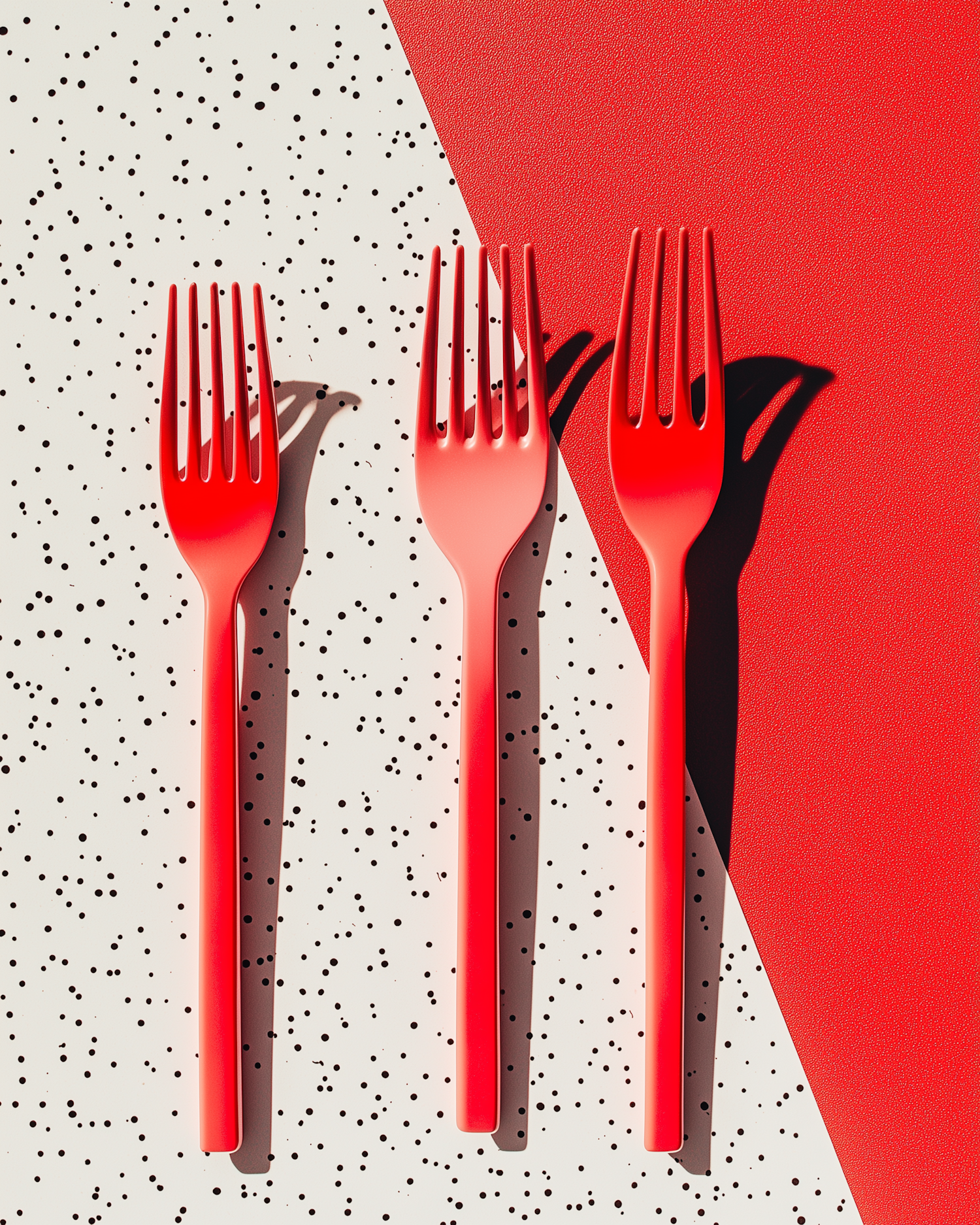 Three red forks on a speckled and red background, casting shadows. A vibrant and symmetrical composition.