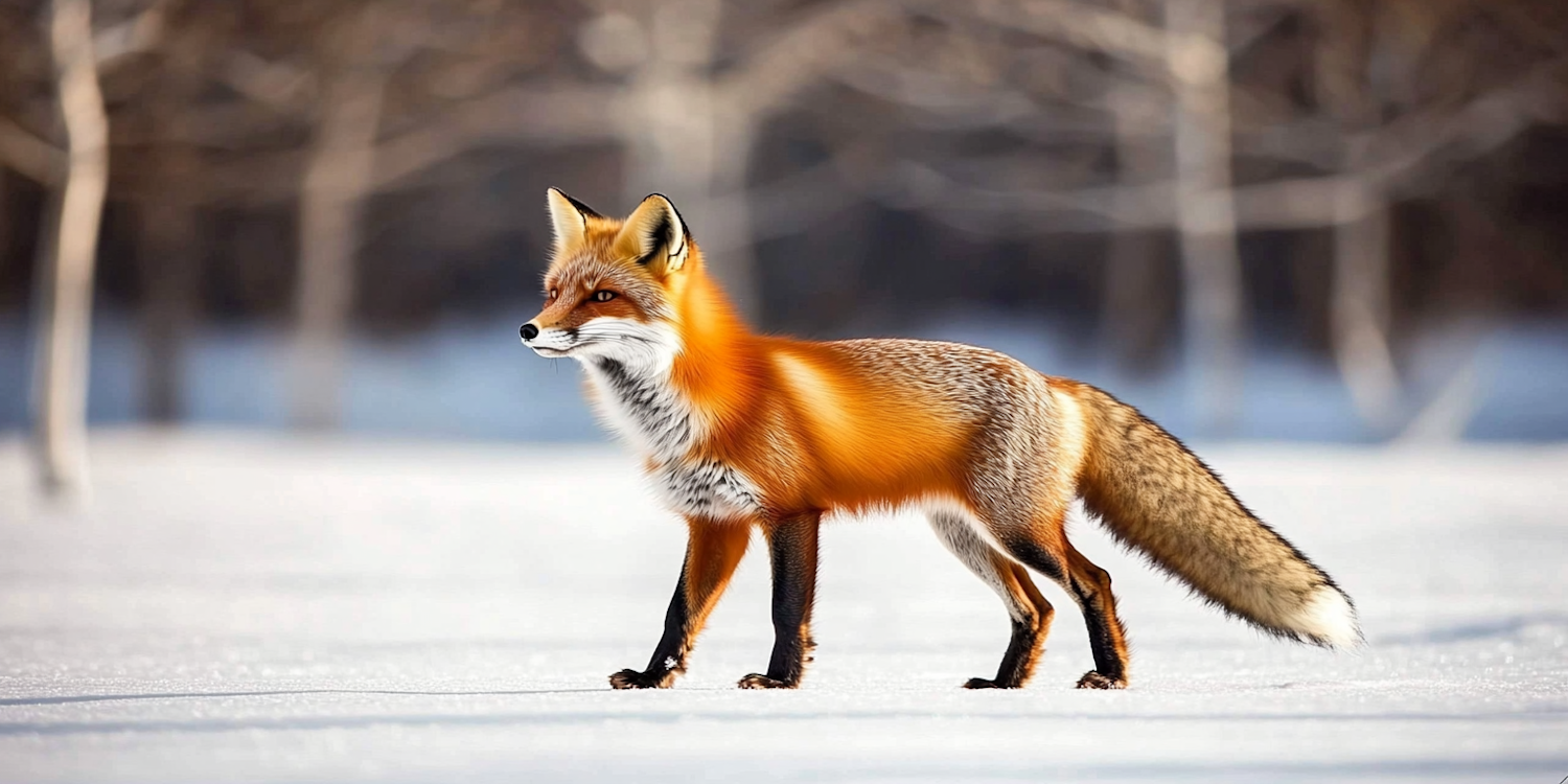 A red fox with vibrant orange fur stands on snow, surrounded by a blurred winter forest. Its bushy tail and alert expression are striking.