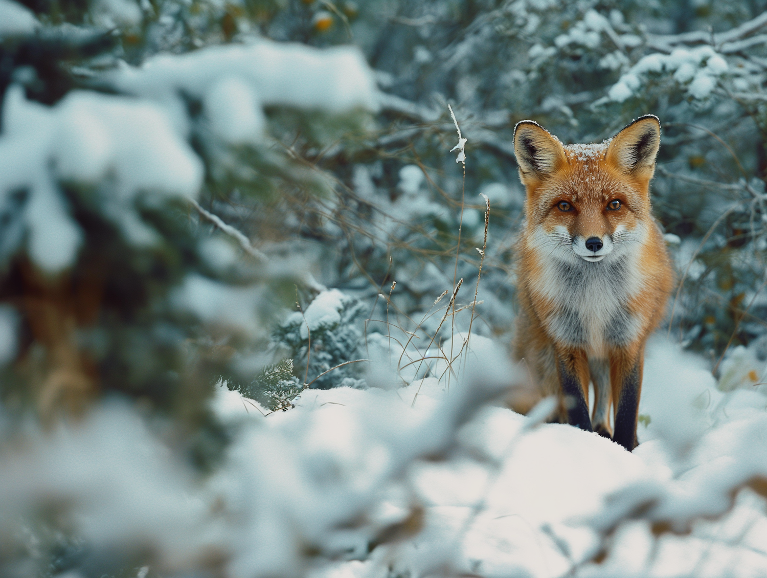 A red fox in a snowy forest, its vibrant fur contrasting with the white snow, creating a serene winter scene.