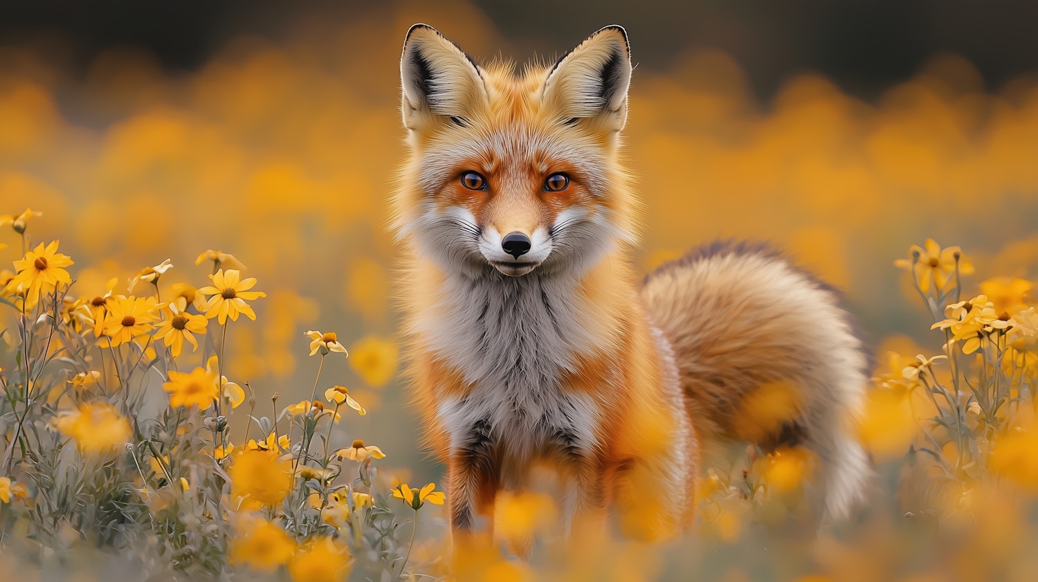 A red fox stands in a field of yellow wildflowers, its orange fur contrasting beautifully with the golden blooms in a serene setting.