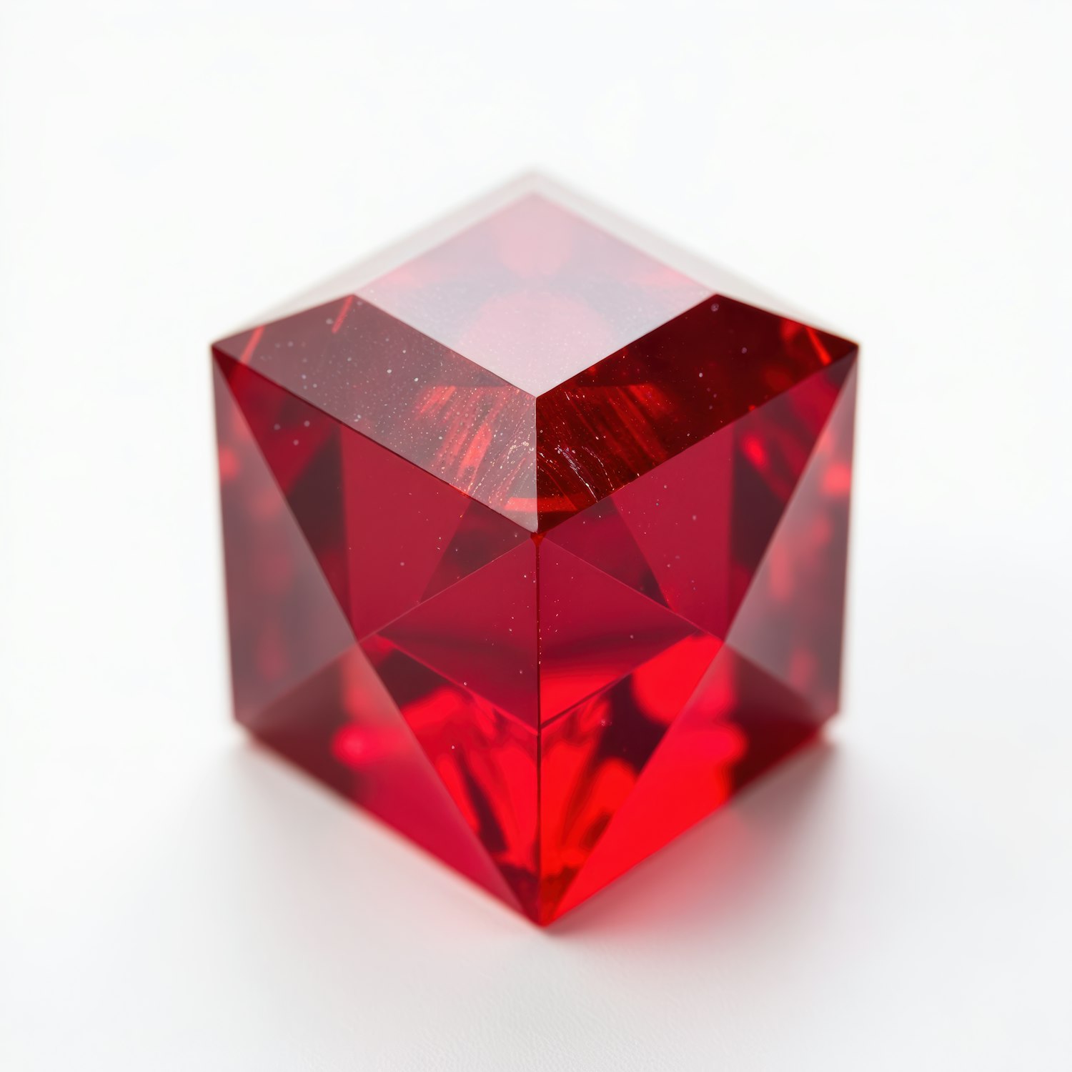 Vibrant red faceted cube with a glossy finish on a white background, resembling a finely cut gemstone.