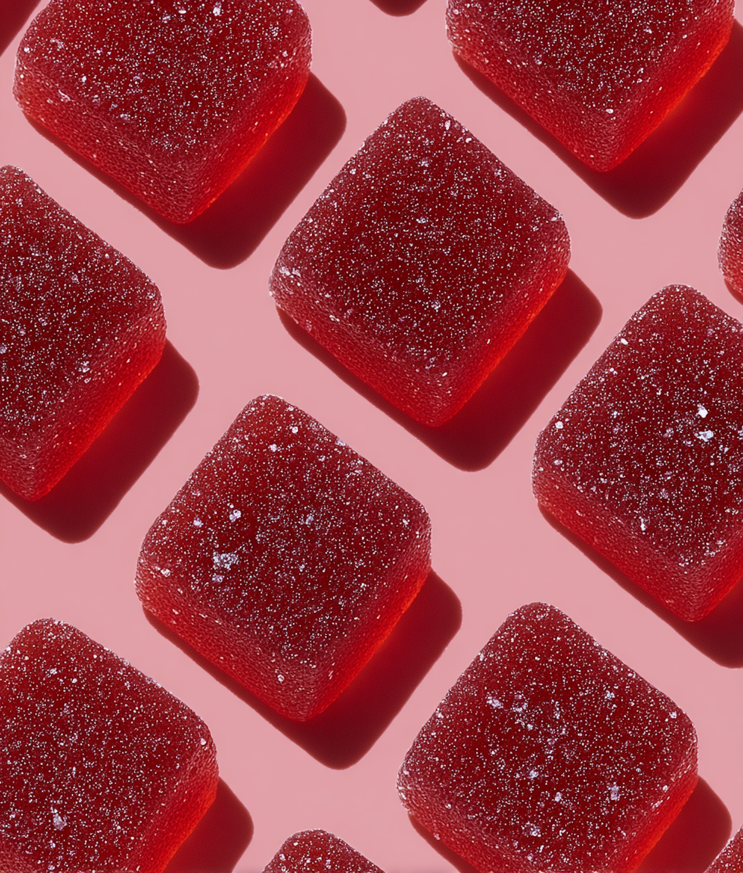 Close-up of red sugar-coated gummy candies arranged in a neat grid on a pink background, showcasing their vibrant color and sparkling texture.