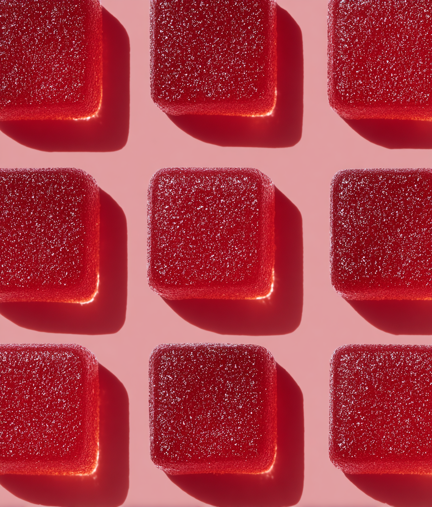A neat grid of red sugar-coated gummy candies on a pink background, showcasing their texture and vibrant color.