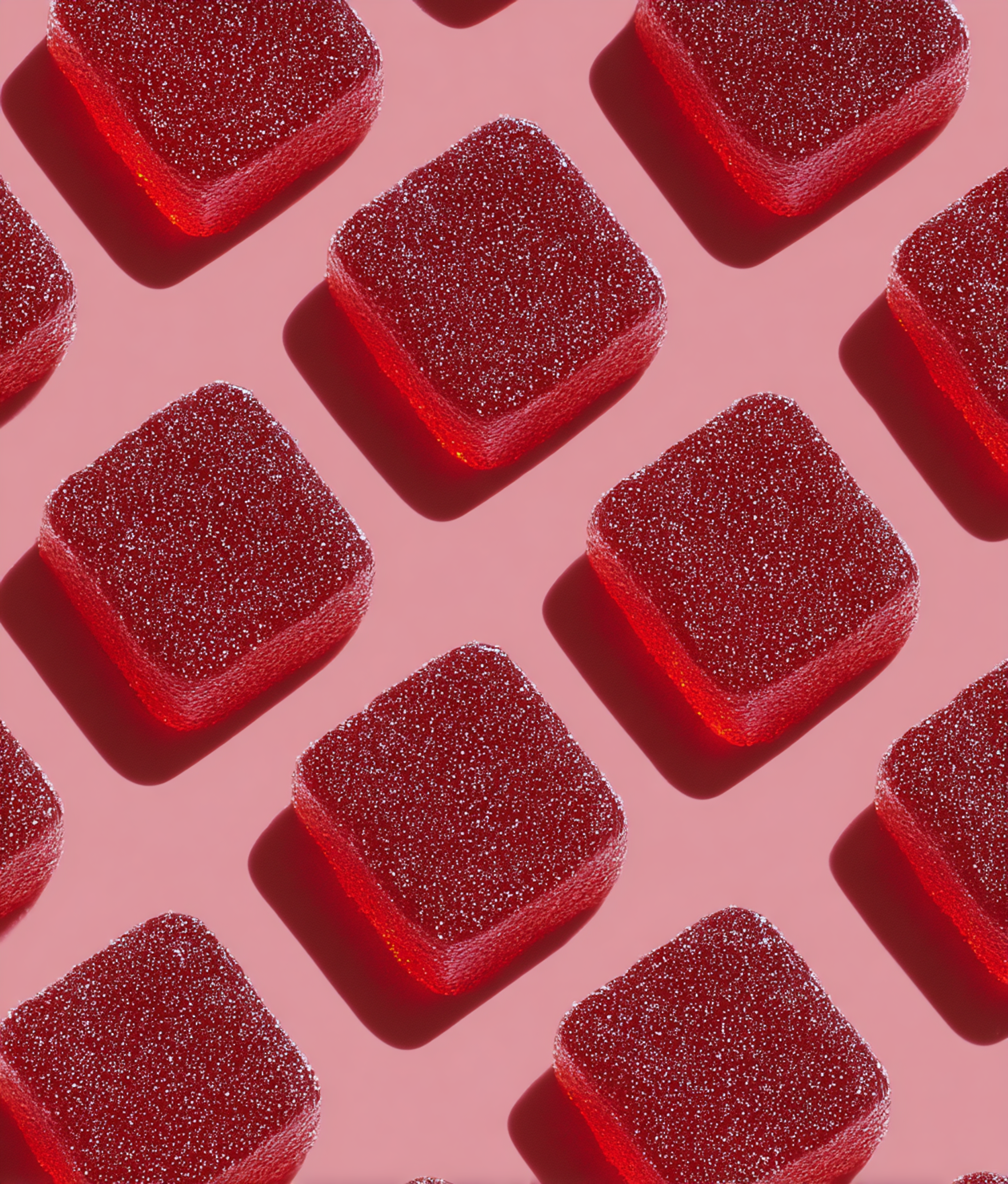 A vibrant pattern of red, sugar-coated gummy candies on a pink background, arranged in a diagonal grid with striking shadows.