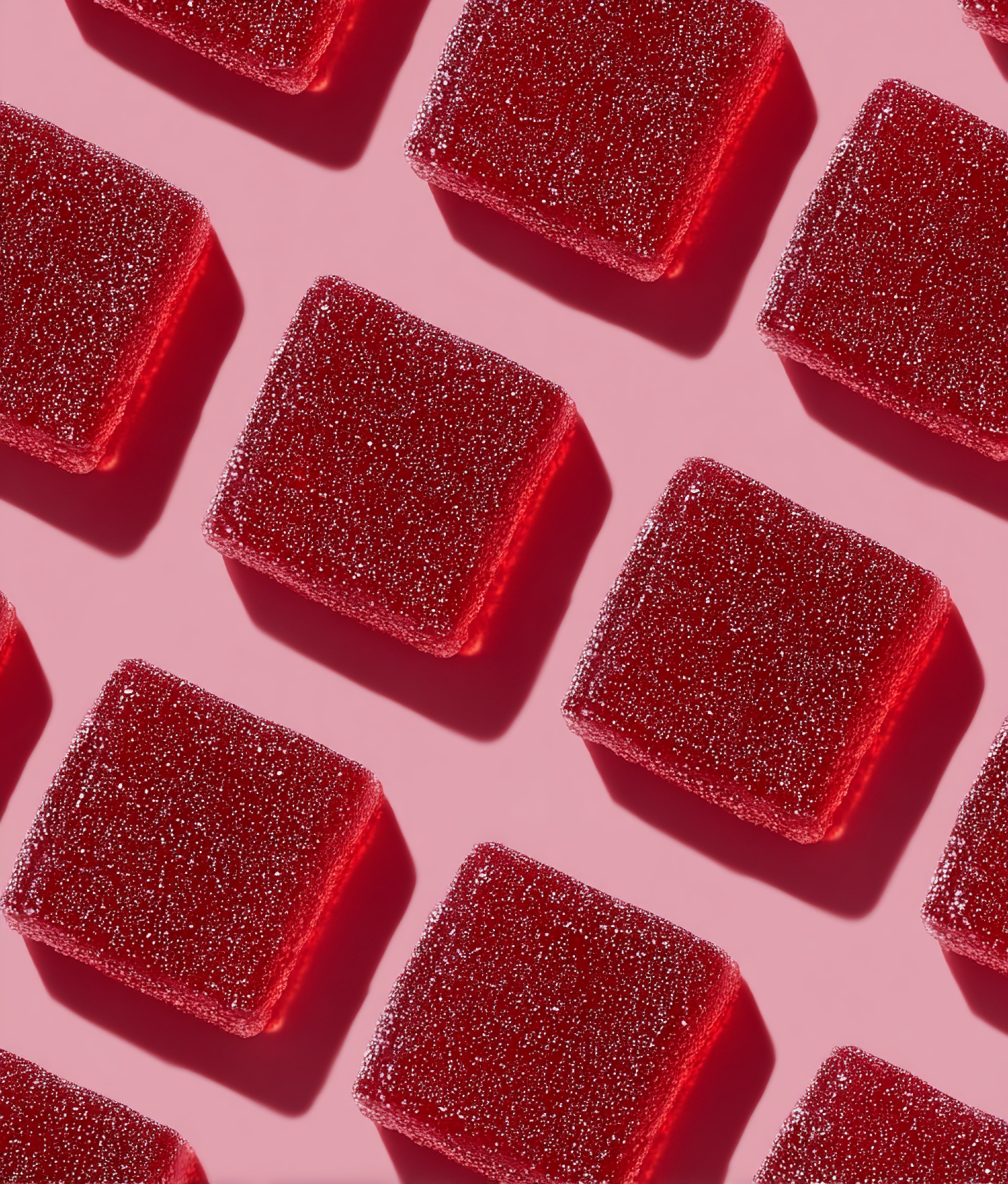 A vibrant arrangement of red sugar-coated gummy candies on a pink background, showcasing their texture and symmetry.