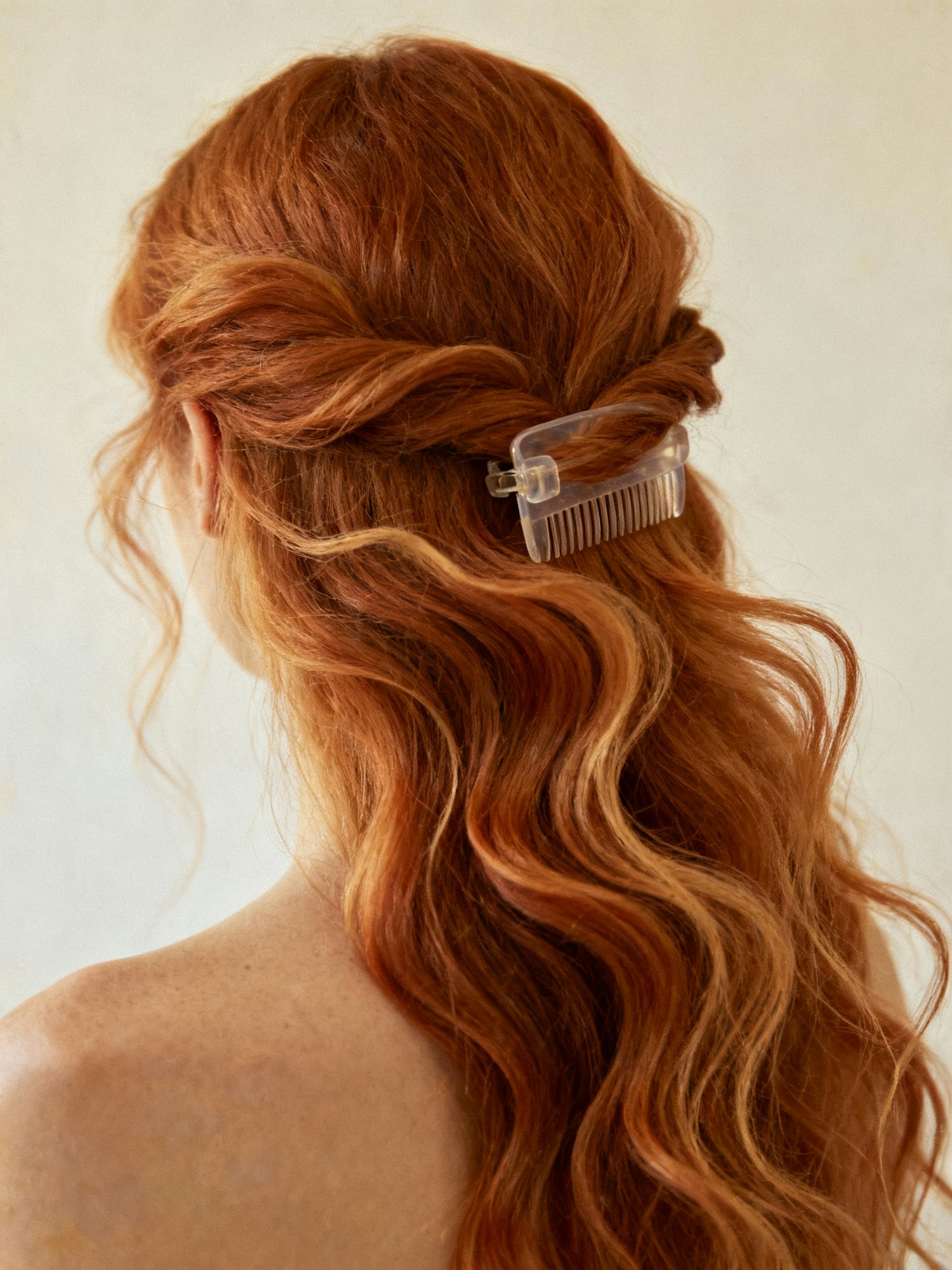 Rear view portrait of a person with long strawberry-blonde hair, styled with irregular bends reminiscent of wind or ocean movement. A single translucent comb clip holds the hair loosely to one side, letting strands fall freely. Lighting diffused and warm, 35 mm film grain, serene and painterly minimalism.