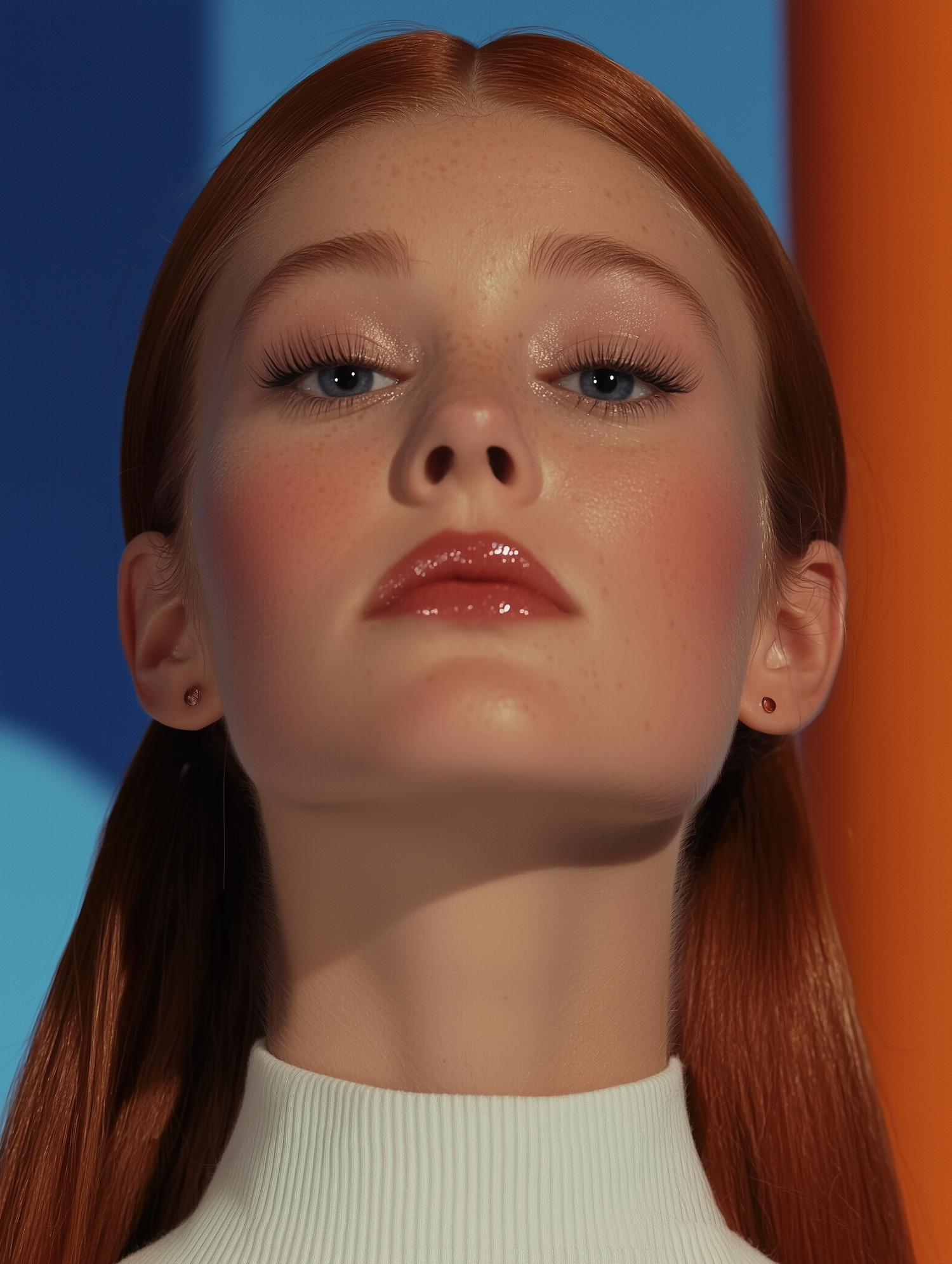 Close-up of a red-haired woman with freckles, glossy lips, and a white top against a vibrant blue and orange background.