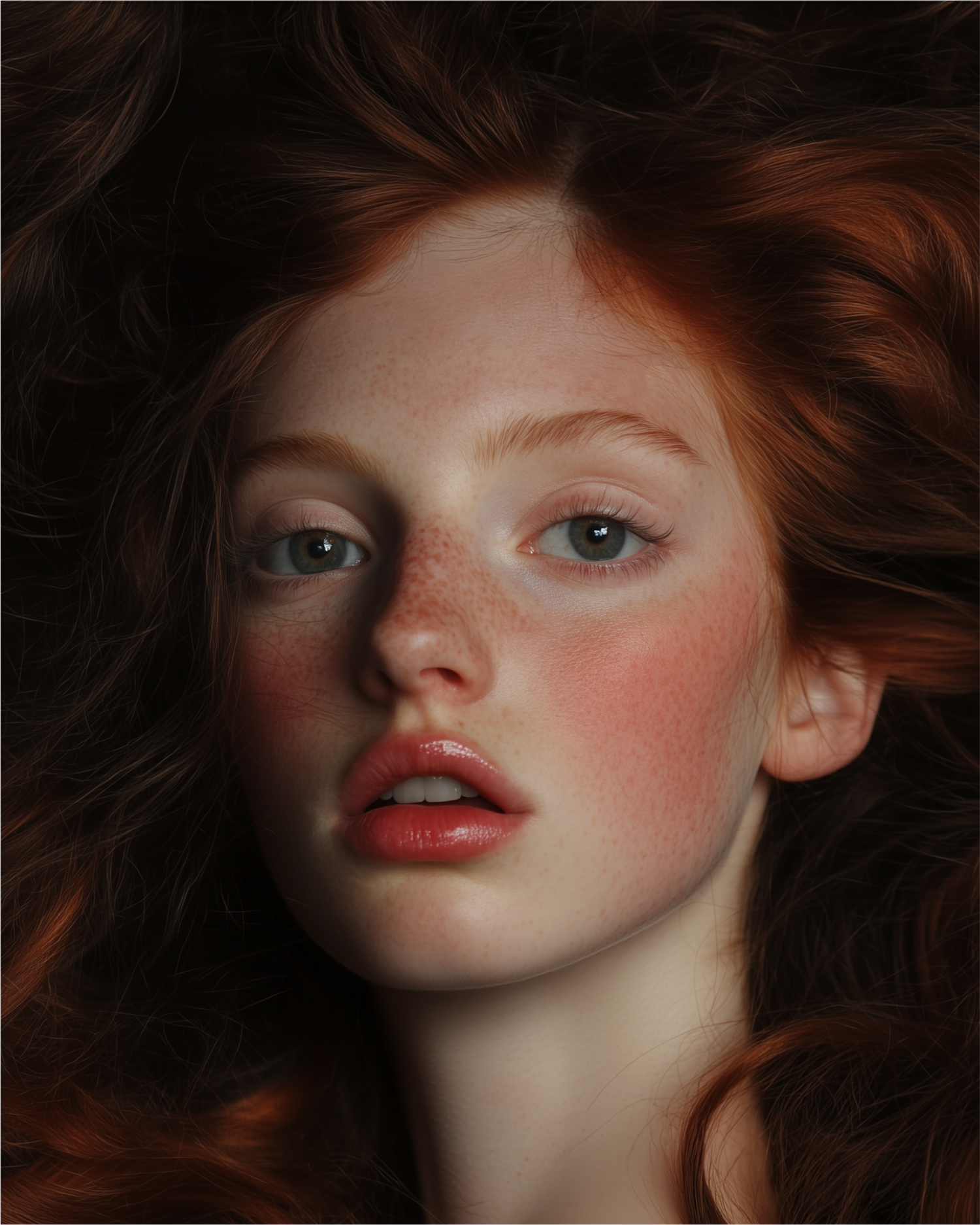 Close-up of a freckled woman with red hair, blue eyes, and glossy lips, set against a dark background for a striking portrait.