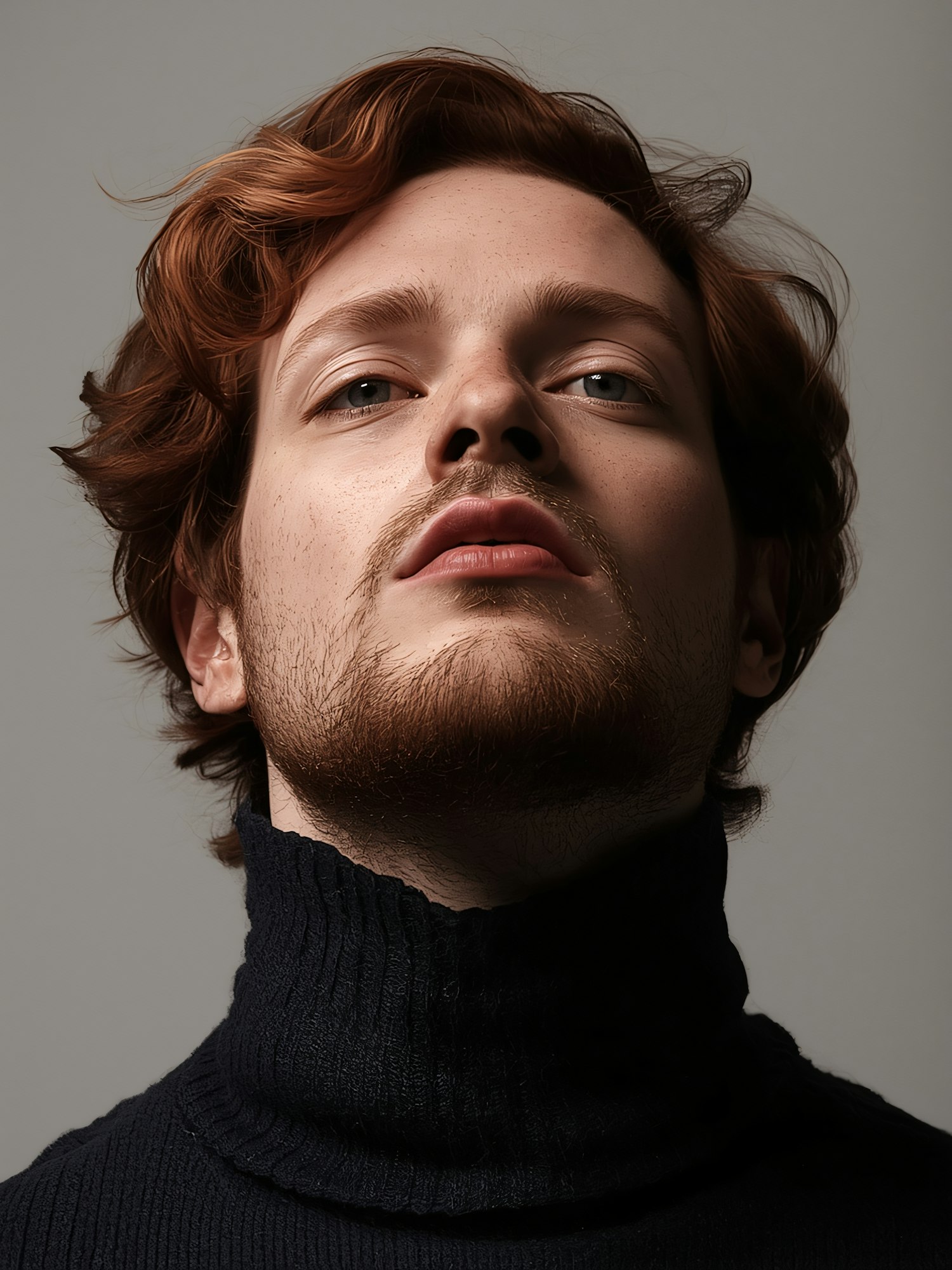 Close-up portrait of a person with red hair, light eyes, and a dark turtleneck, set against a neutral gray background.