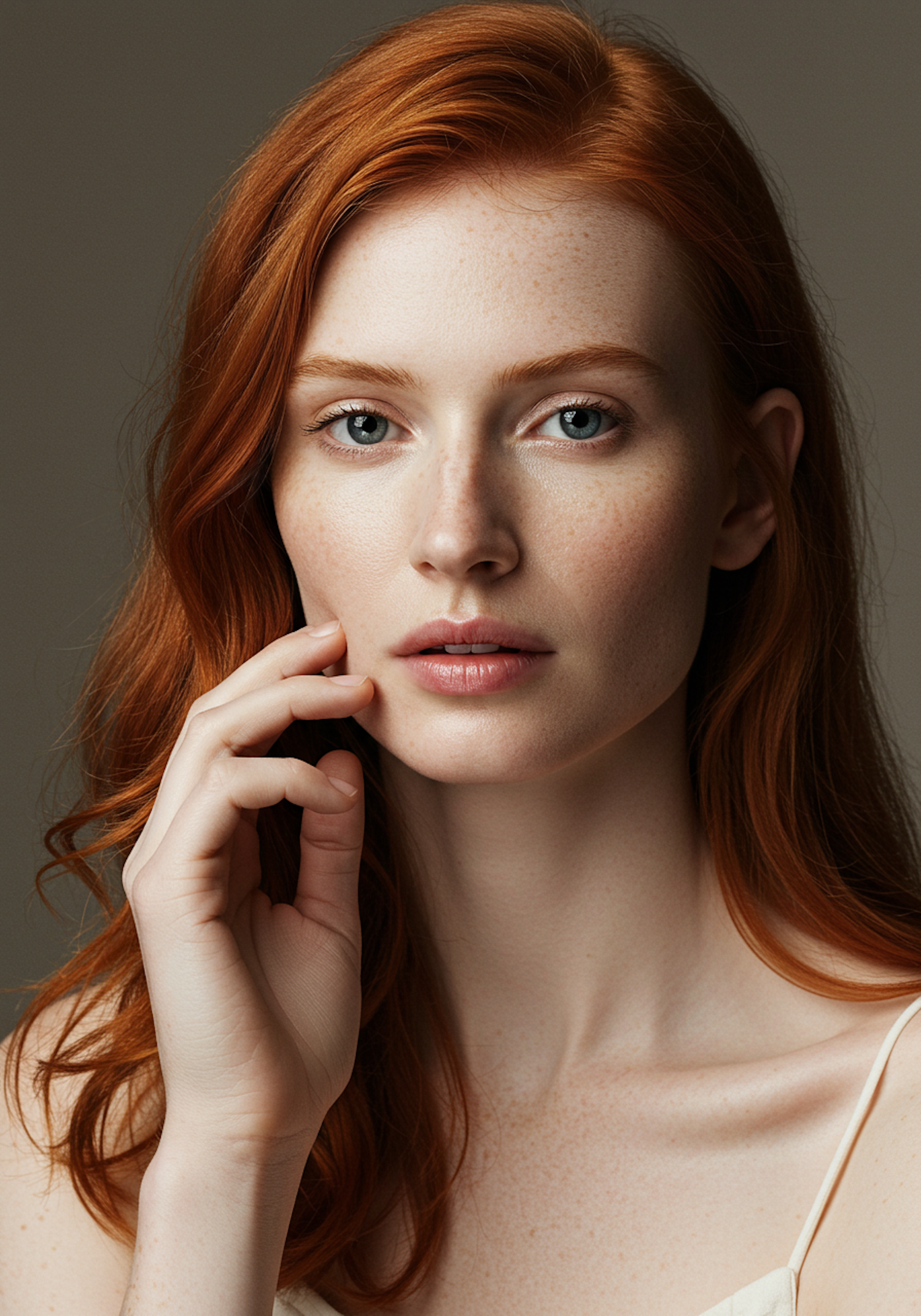 Close-up of a red-haired woman with freckles and blue-green eyes, gently touching her cheek against a neutral background.