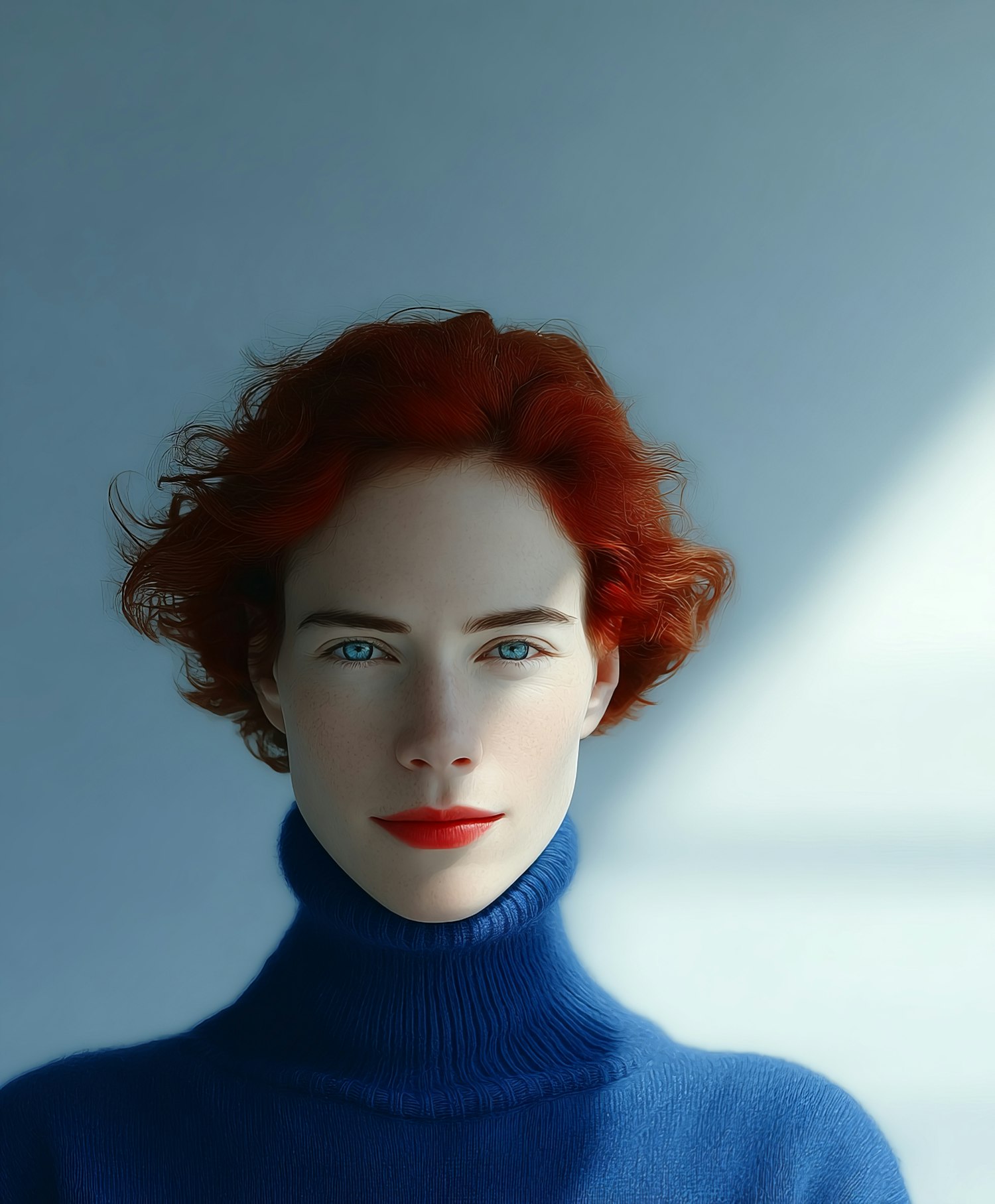 A striking portrait of a red-haired individual in a blue turtleneck, with vibrant colors and soft lighting creating a serene atmosphere.