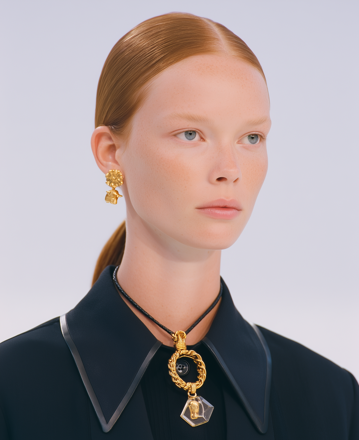 Close-up of a woman with sleek red hair, gold jewelry, and a black collared shirt, set against a soft blue background.
