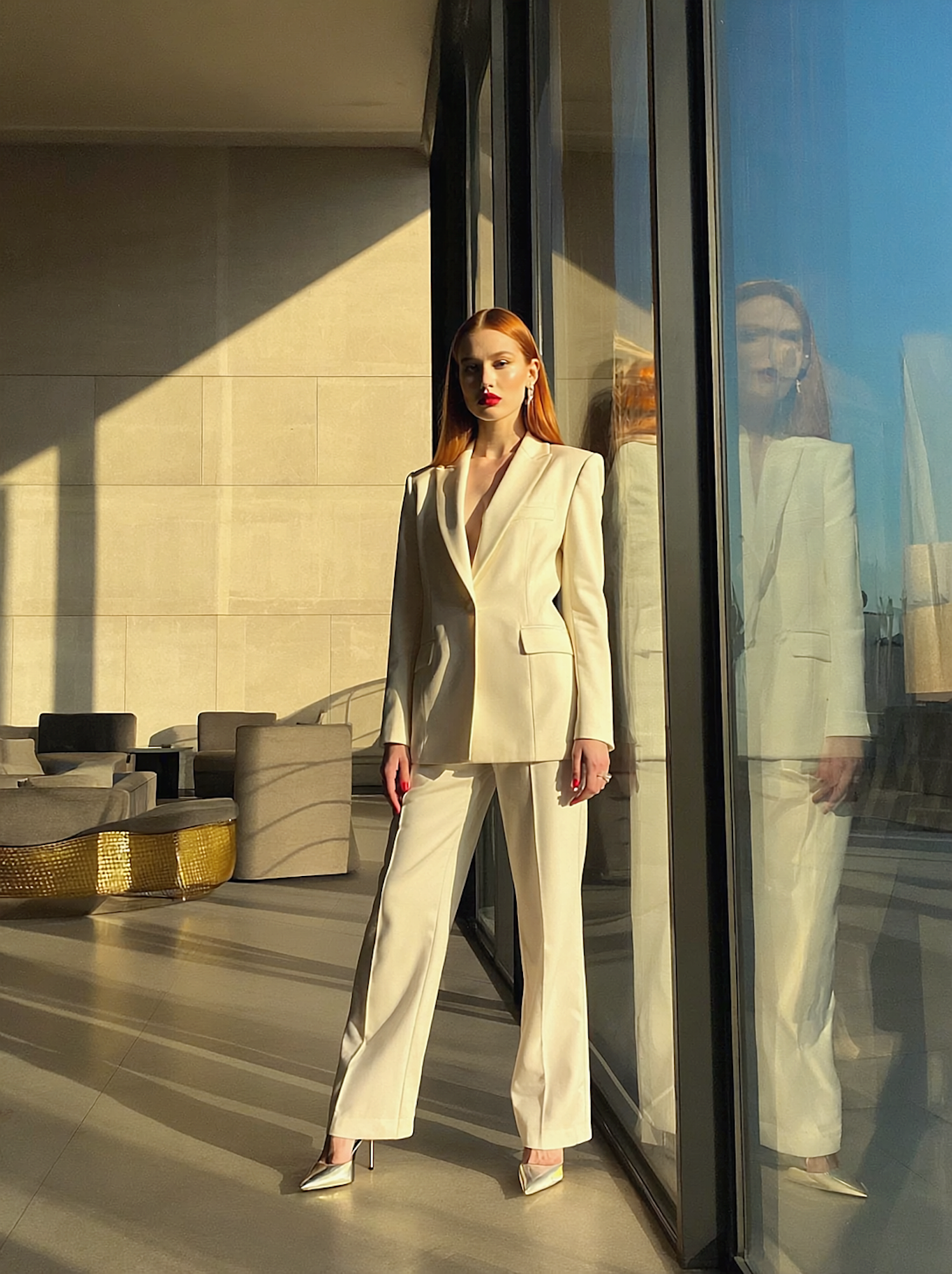 Elegant woman in a cream suit with bold red lipstick, standing in a sunlit modern interior with glass reflections and minimalist decor.