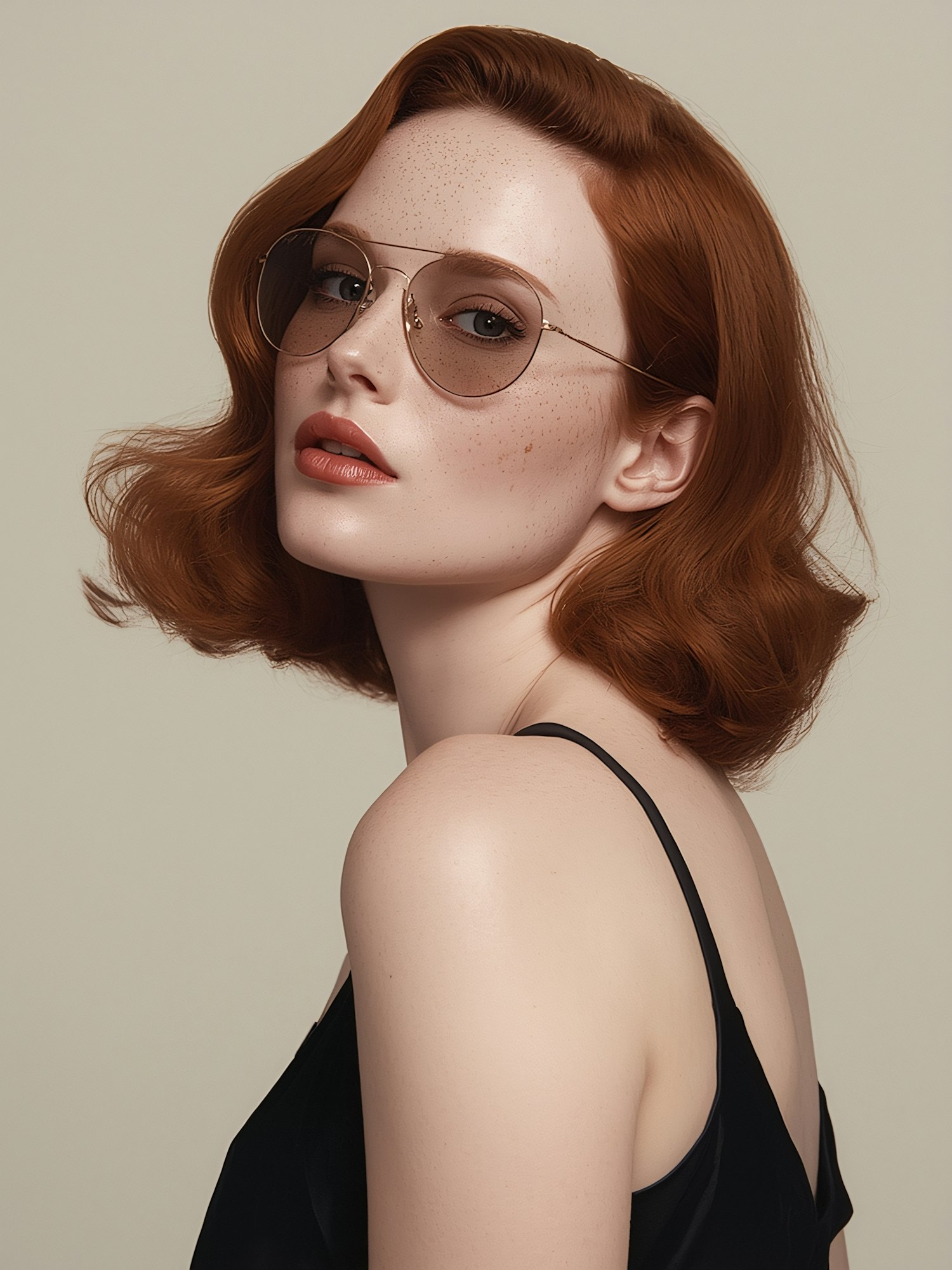 A red-haired woman with aviator glasses and a black top poses against a beige background, showcasing her freckled complexion and confident gaze.