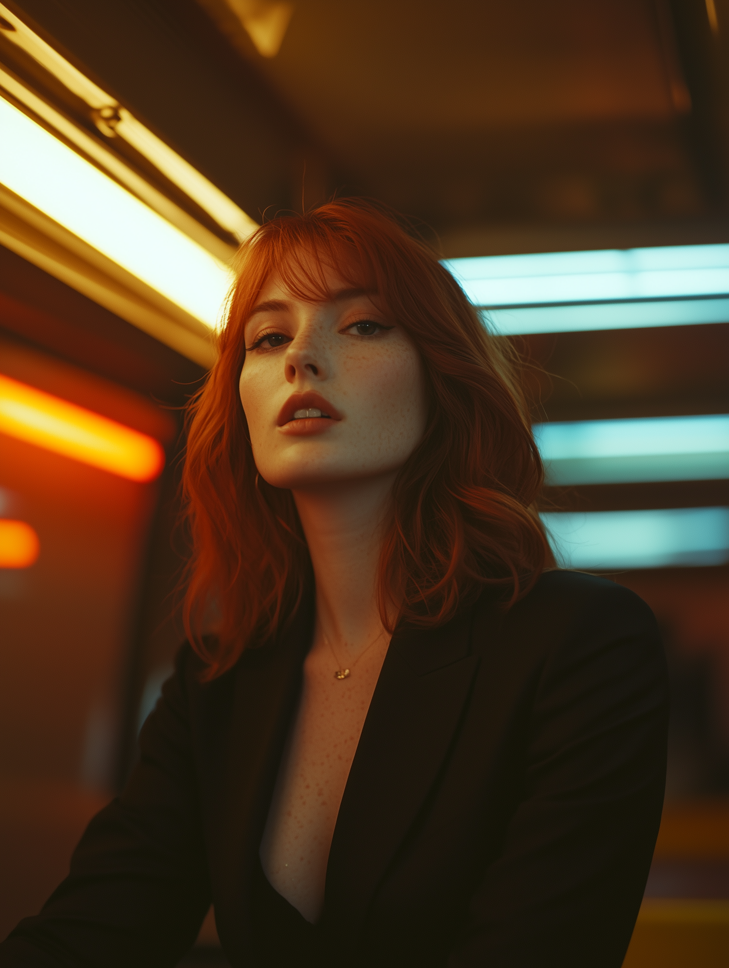 A red-haired woman in a black blazer poses under neon lights, blending warm and cool tones for a cinematic, moody vibe.