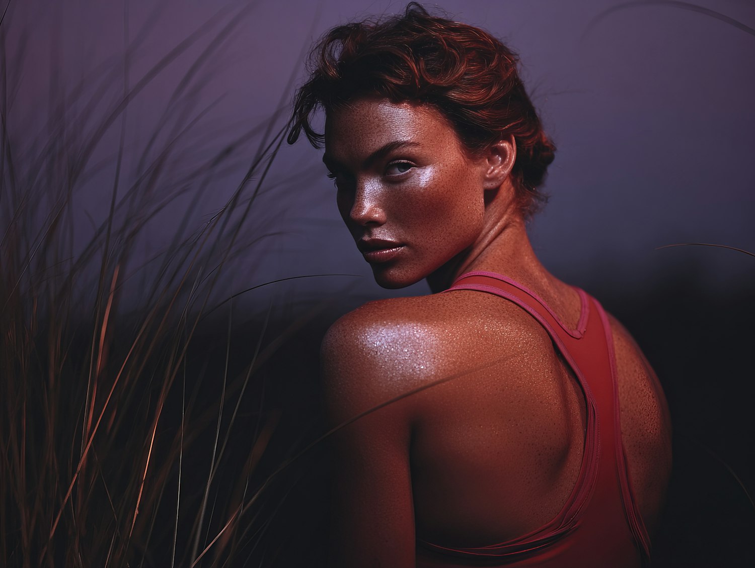 A striking portrait of a woman with red hair in a red tank top, set against a moody background with tall grass and dramatic lighting.