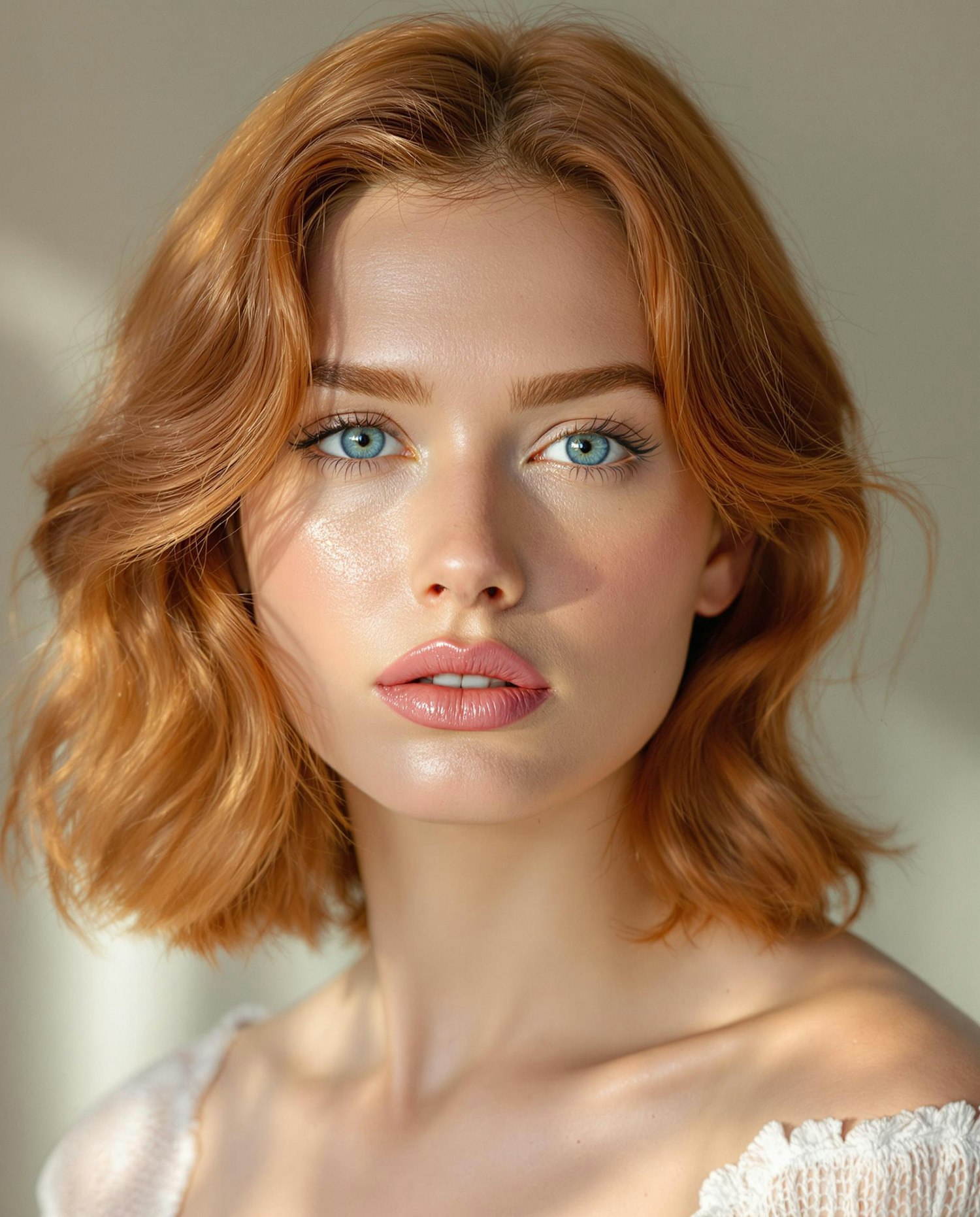 beauty photography, ultra-detailed portrait of a redhead model with luminous glass skin, emphasizing dewy complexion enhanced by snail mucin infusion, refined eyebrows, clean lips, clean hair, trendy layered haircut, soft pastel lighting, minimalist backdrop, high-resolution, natural skin, ultra-detailed skin, skin pores, hdr, high-resolution, sharp focus