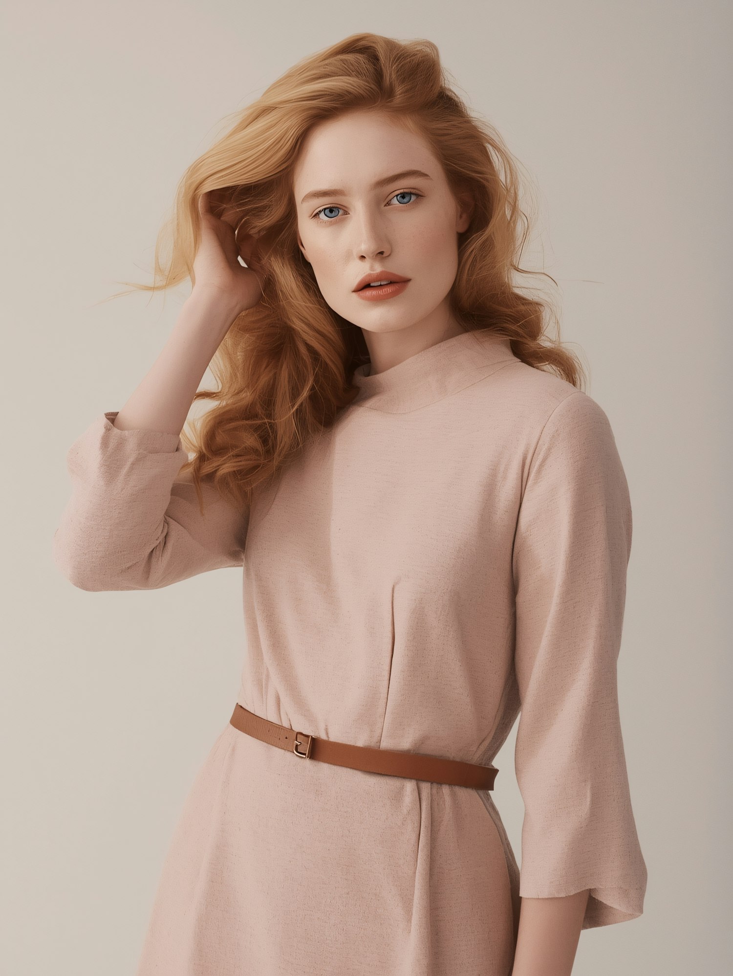Elegant woman with red hair in a pink dress and brown belt, posing gracefully against a neutral background.