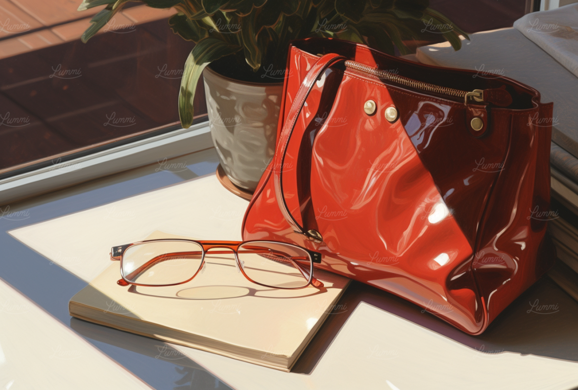 Elegant red handbag and glasses on a book, bathed in sunlight, with a potted plant in the background.