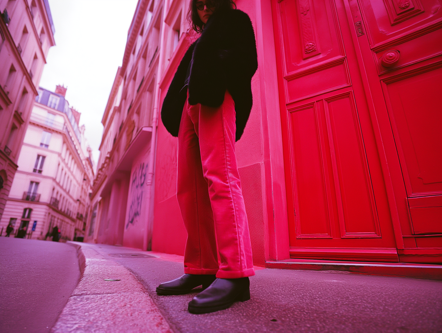 Urban street scene with a person in red pants and black jacket, set against a striking red door. Vibrant and modern atmosphere.