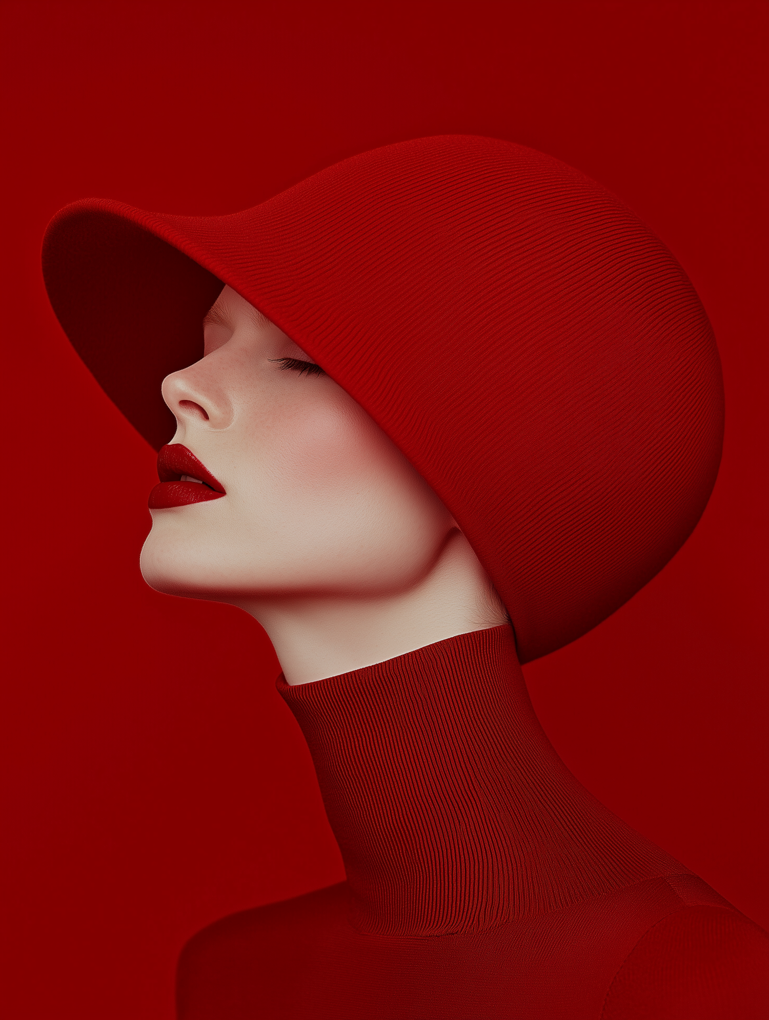 Elegant portrait of a person in a red hat and high-necked garment, with deep red lips and a serene expression against a red background.